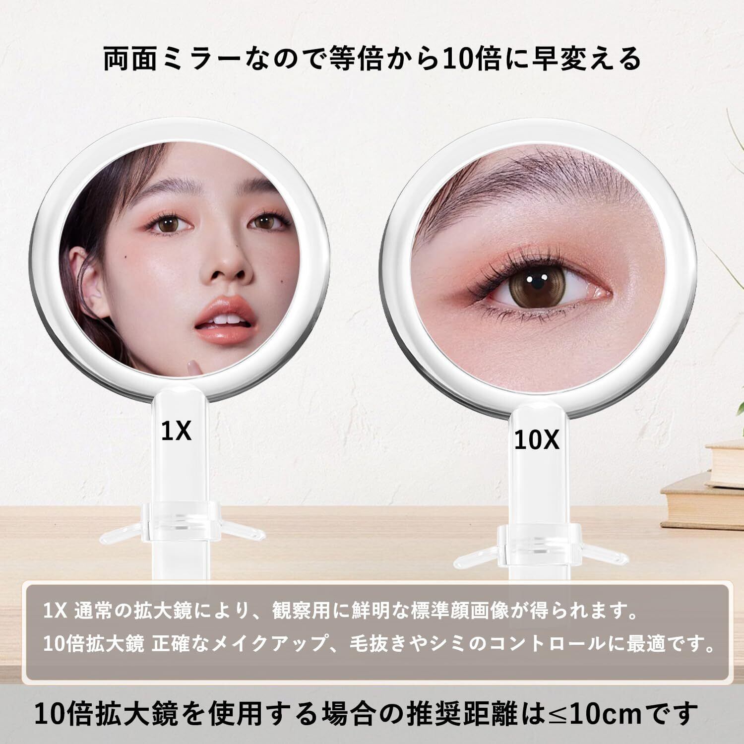 【両面手鏡と強力10倍拡大鏡】スタンド付きハンドヘルドミラーは両面デザインを採用しており、1倍ミラーと10倍ミラーを切り替えて完璧な反射を実現できます。通常の等倍の鏡面は、あなたの日常的なニーズに合わせて、顔全体を高精細に映し出します。もう片面は 10 倍に拡大できを使用すると、眉毛を描いたり、まつげを塗ったりするなど、顔のより正確なメイクをしたり、黒ずみ、ニキビ、毛穴などの肌の欠陥を発見したりできます。強力な10倍の拡大率で、肌や髪型がはっきりと見えます。注 - 10 倍拡大鏡を使用する場合、最適な鮮明度を得るために、最初に目から約 10 cm 離して置く必要があります。