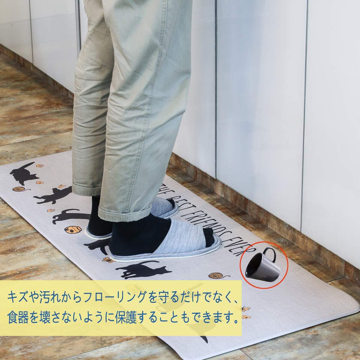 【厚いPVC】 足が疲れにく設計、もちもちの踏み心地でクッション性が高く台所マットです。長時間の立ち仕事も疲れにくい。このマットは素足でも、スリッパを履いたままでもいいです。物が落下しても衝撃を吸収し、床をキズやヘコミから守ります。