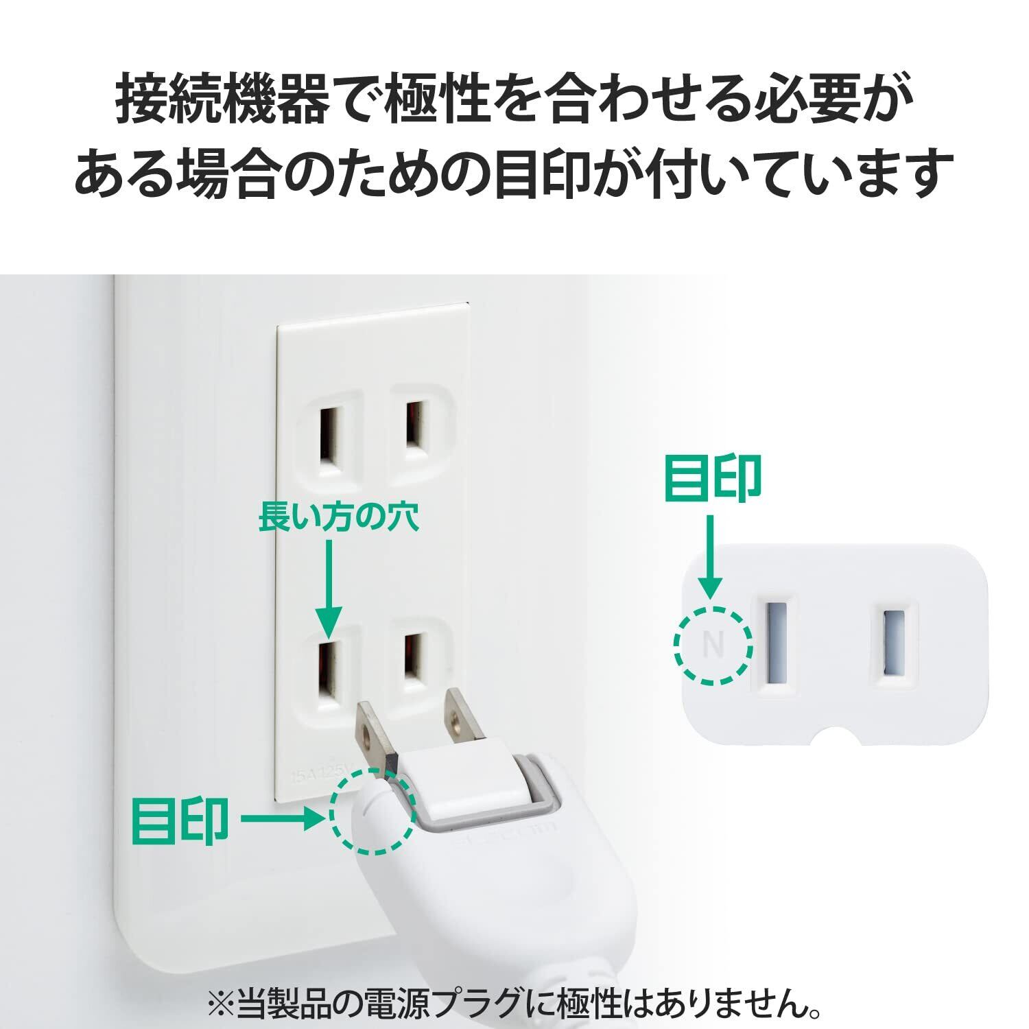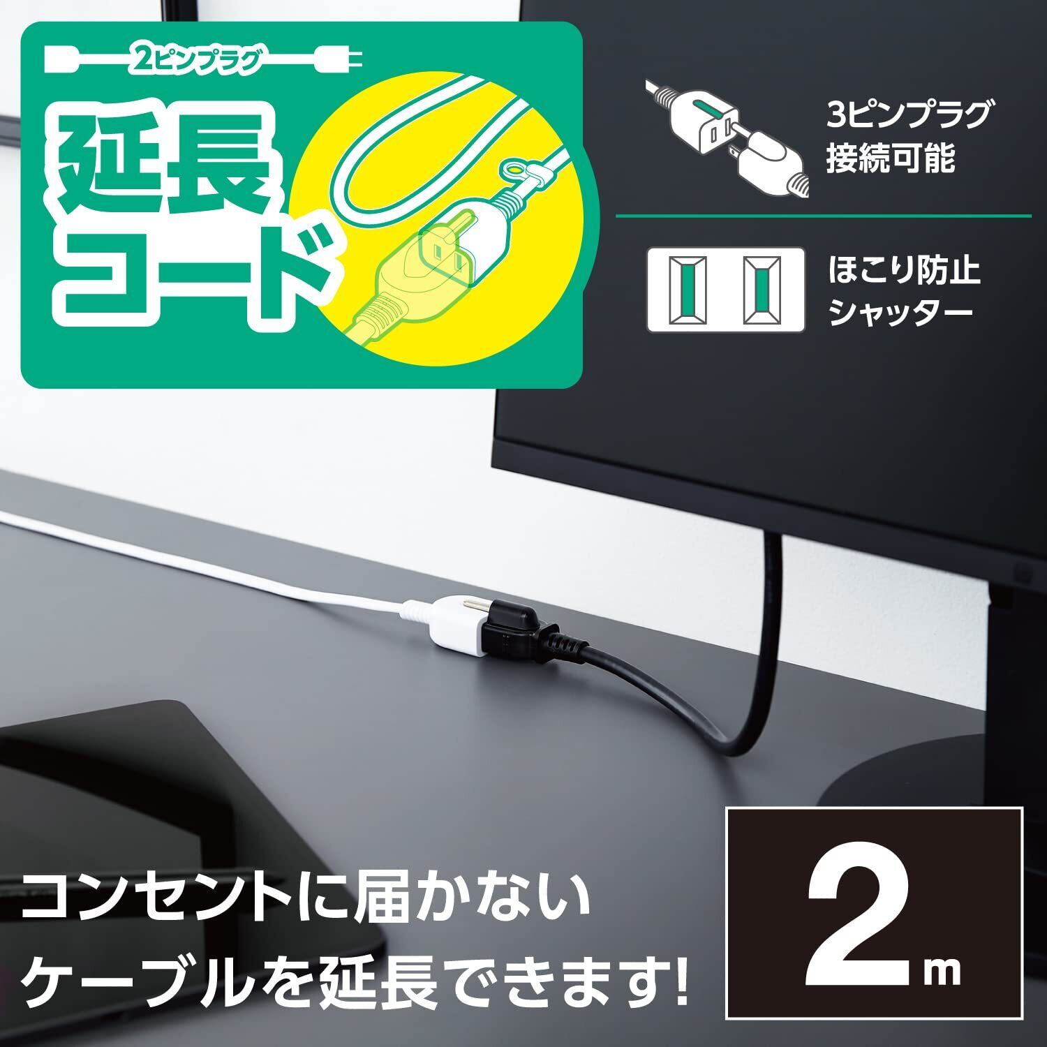 ●機器のコードがコンセントに届かない場合などに、電源を延長するためのコードです。●差込口は1個口で、極性のある2ピン式プラグ(左右のピンの幅が異なるタイプ)・3ピン式プラグも接続できる構造になっています。●※3ピン式プラグ使用時、アースは機能しません。●電源プラグに極性はありません。●接続機器で極性を合わせる必要がある場合、コンセントの長い方の穴と電源プラグの目印線側を合わせて差し込んでください。●使用しない際に差込口へのホコリの侵入を防止する「ホコリ防止シャッター」を装備しています。●差込口の一部には耐熱性に優れた熱硬化性樹脂を使用しており、万一の発熱の際にも融解しにくく、電気火災の防止に有効です。●直径10mmの吊り穴を配したシリコン製のタグが付属しており、フックなどに引っ掛けることができます。●電源コードには一般社団法人日本配線システム工業会規格(JWDS0010)に適合した二重被ふくコードを採用しており、断線や被ふく破れによる感電・火災の防止に有効です。●プラグには栓刃間に火災の原因となるトラッキング現象防止に有効な熱硬化性樹脂を配し、感電の危険を抑制する絶縁スリーブを装備しています。●狭い場所でも配線しやすい180度スイングプラグを採用しています。●エレコム社環境認定基準を1つ以上満たし、『THINK ECOLOGY』マークを表示した製品です。●環境保全に取り組み、製品の包装容器におけるプラスチック重量を、社内基準製品より20%以上削減した製品です。●環境保全に取り組み、製品の包装容器が紙・ダンボール・ポリ袋のみで構成されている製品です。