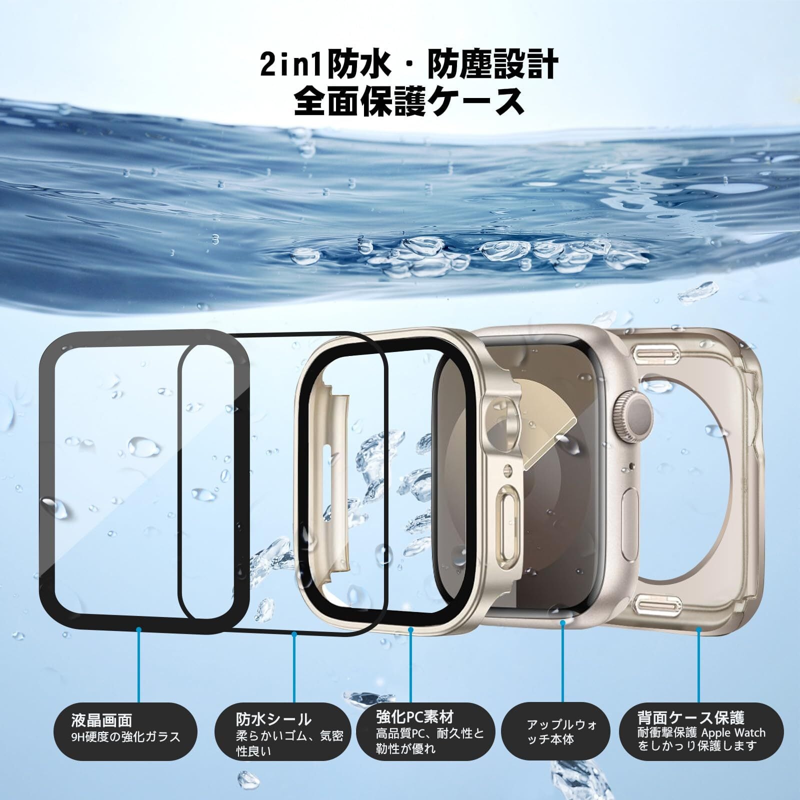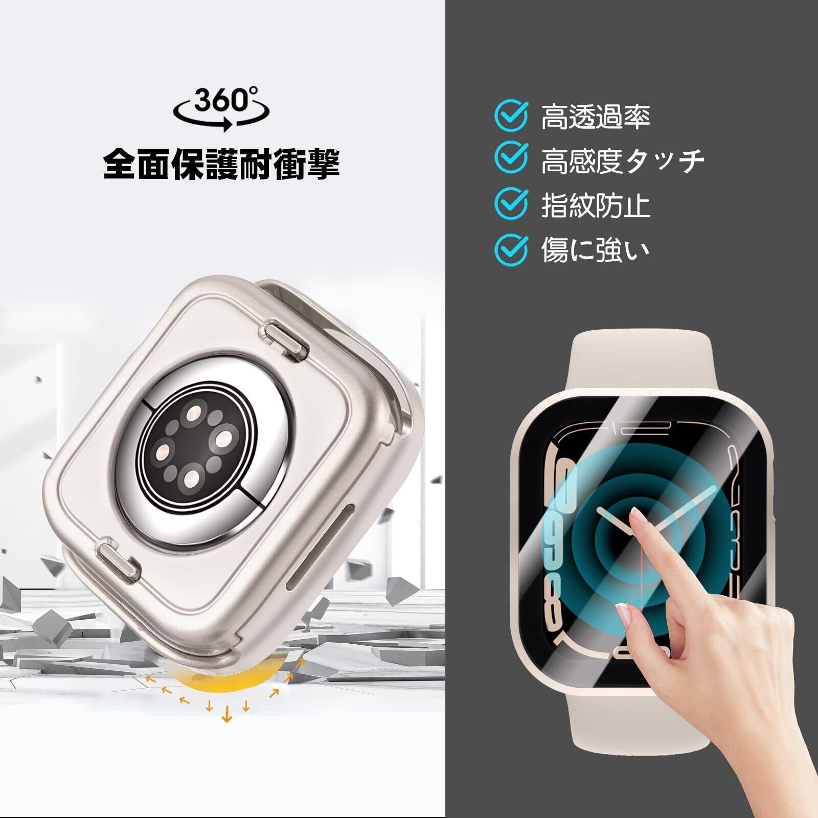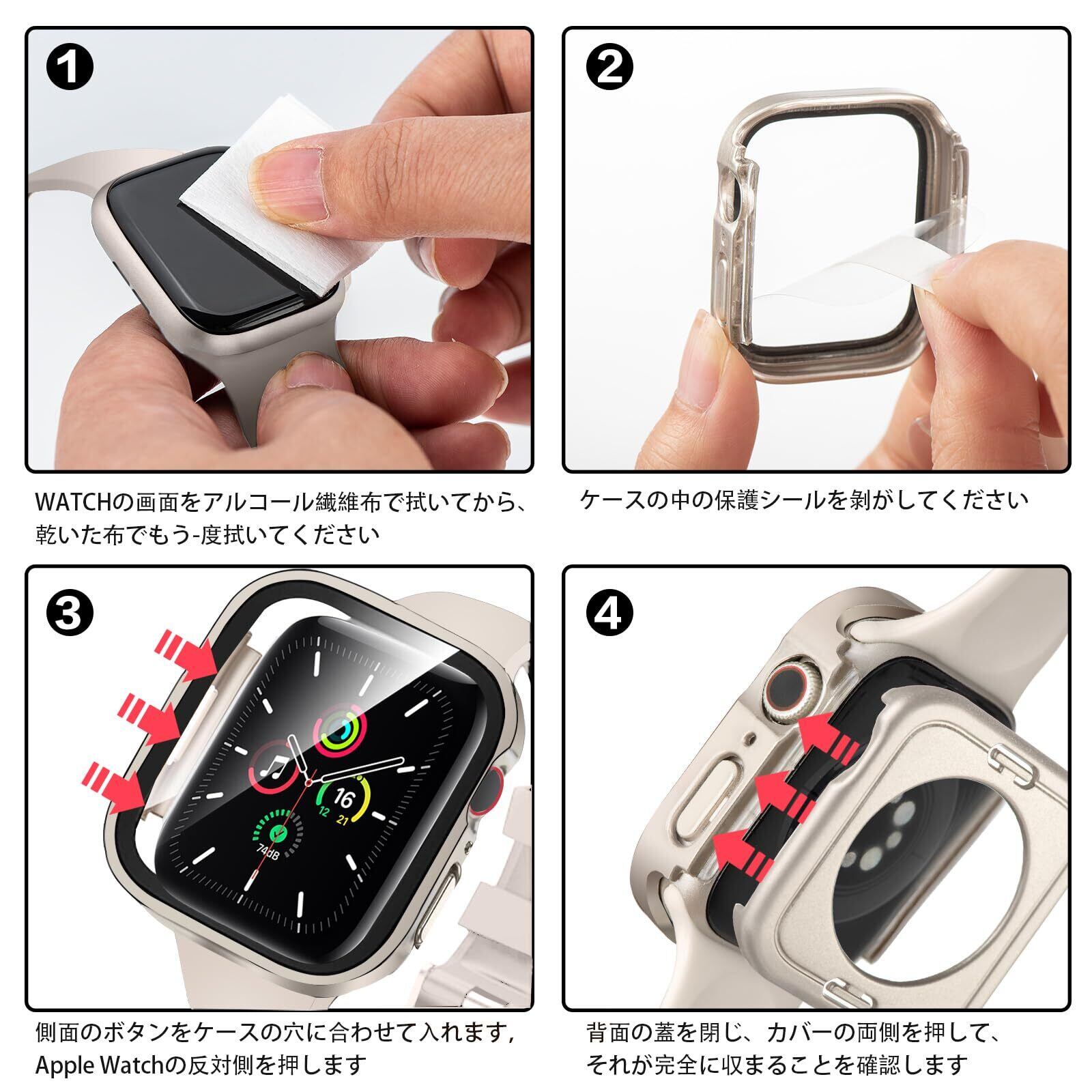 【防水・防塵ケース】シーリングリング内蔵したアッApple Watch ケース、アップルウォッチの画面にぴったりとフィットし、アップルウォッチ前面カバーと背面カバーの2 in 1全周保護設計で,表面から裏面まで 360度の全面保護します、IP67防水、防塵設計。ケースを取り外して水を拭くすることを繰り返す必要はありません。疎水性撥油性抜群の強化ガラス表面により、カバー面に水が溜まらず、シャワー、手洗い、発汗、運動、雨など、日常の使用に適しています。 ※ご注意:ウォッチの画面とカバーの間に水が浸入する場合、保護カバーを取り外し、柔らかい布で水を乾かしてください。