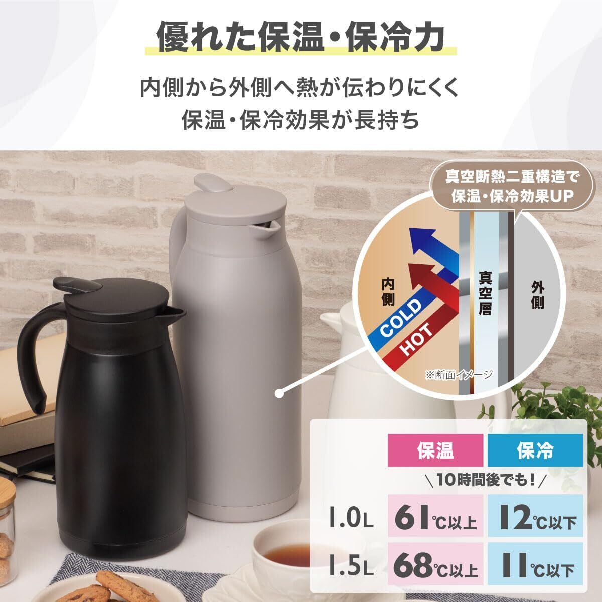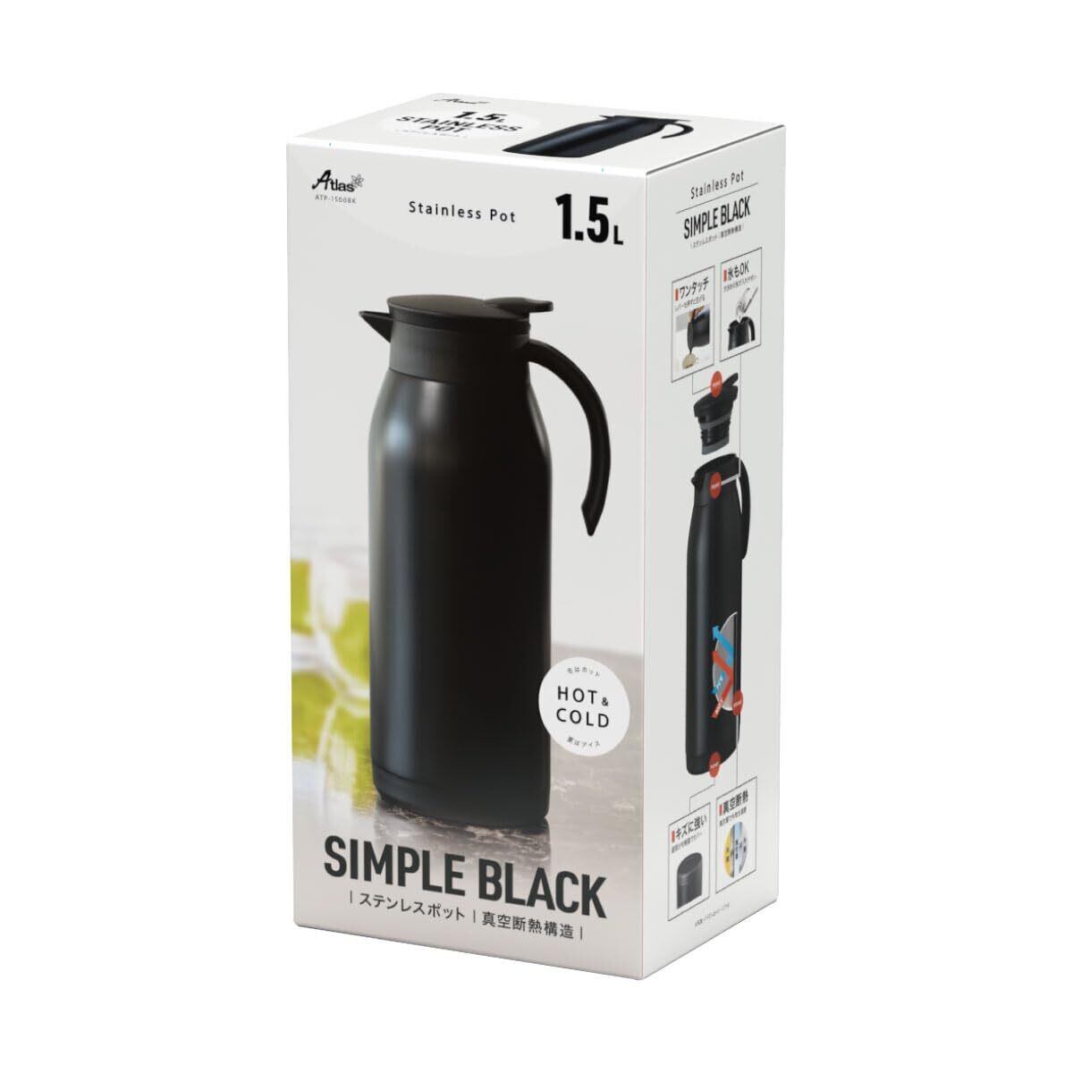 アトラス 保冷ポット 保温ポット 1.5L 軽量スリム 節電 省エネ 時短 エコ 卓上ポット ステンレスポット 魔法瓶 保温 保冷 真空断熱二重構造 洗いやすい ワンタッチレバー 広口 ブラック 白湯 ATP-1500BK