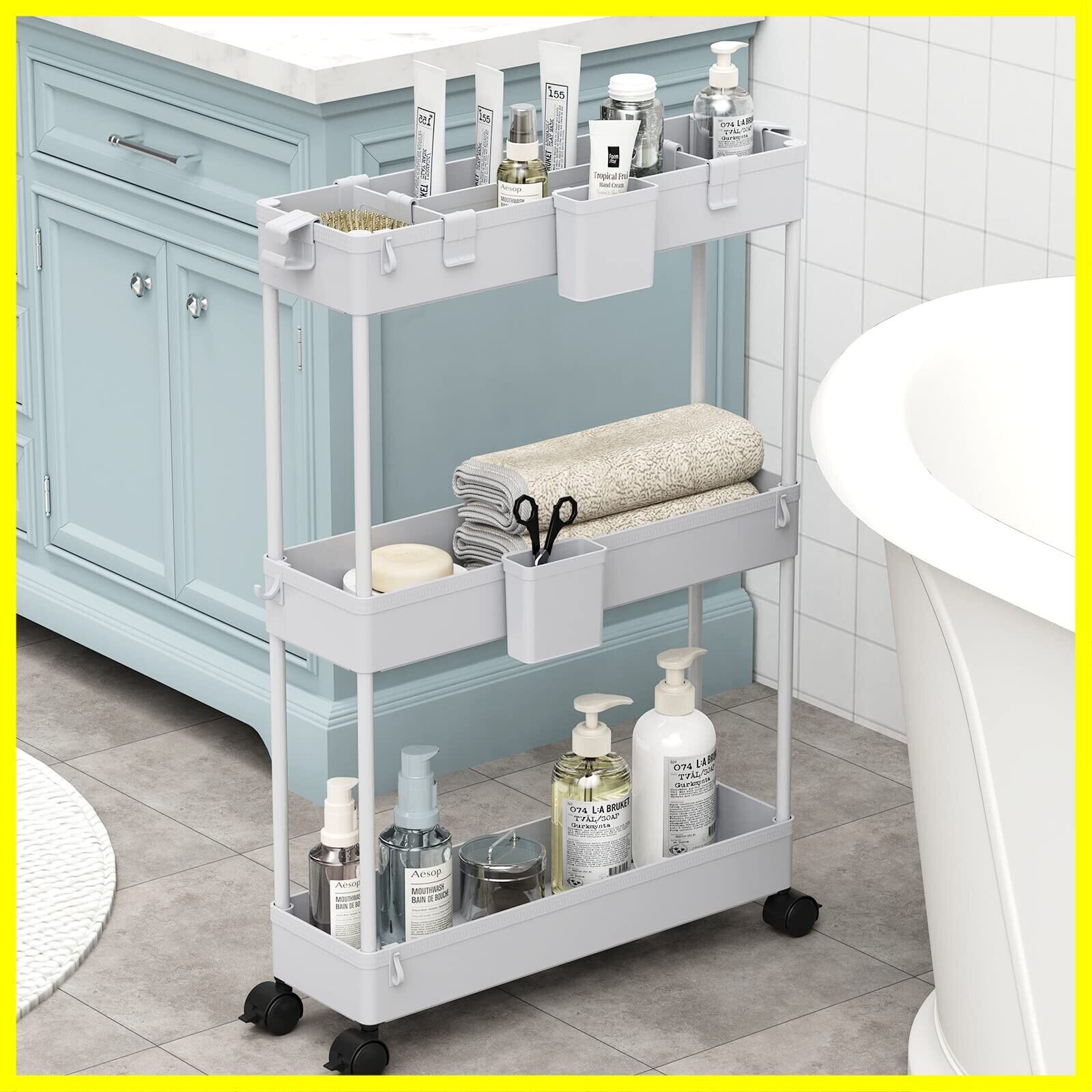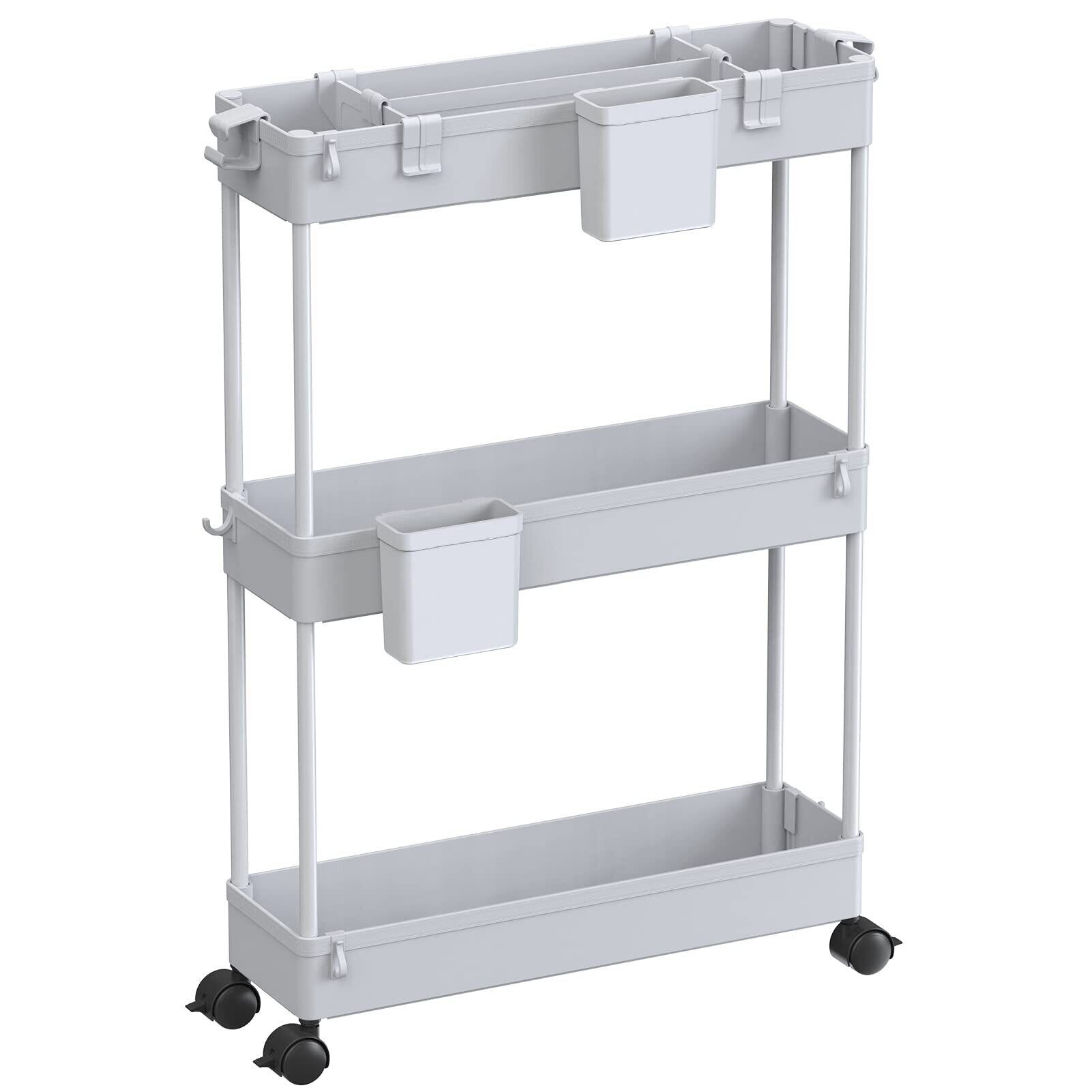 SPACEKEEPER キッチンワゴン 隙間収納 スリム 13cm 収納カップ 仕切板付き 多機能 小物 食品 調味料 キャスター付き 組立簡単 浴室 台所 冷蔵庫横 3段 グレイ
