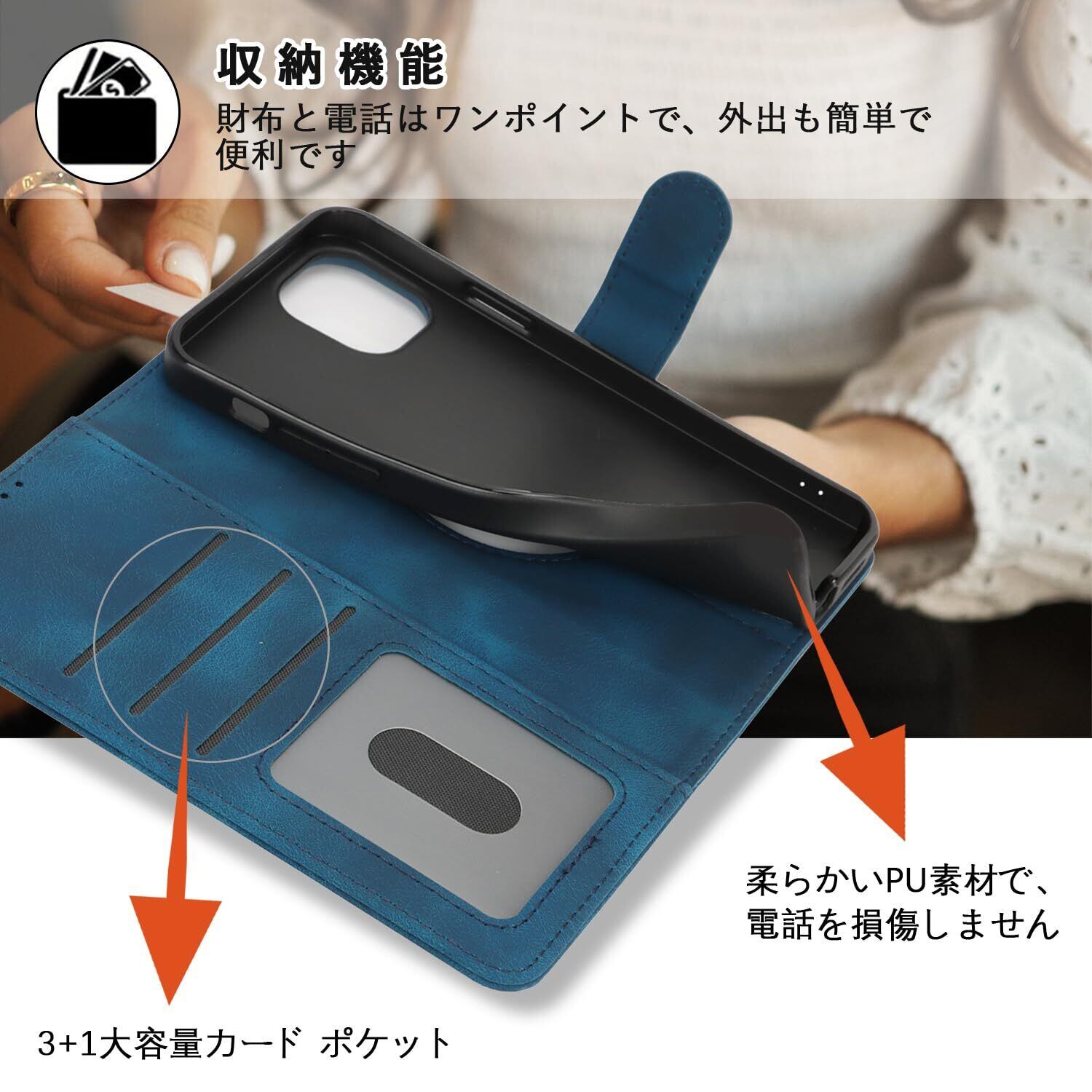 【収納機能】ケース内側に実用性のカード入れポケット×3、内側ポケット×1。カード類や紙幣 、名刺、免許証などを入れることができ、日常の生活に便利。