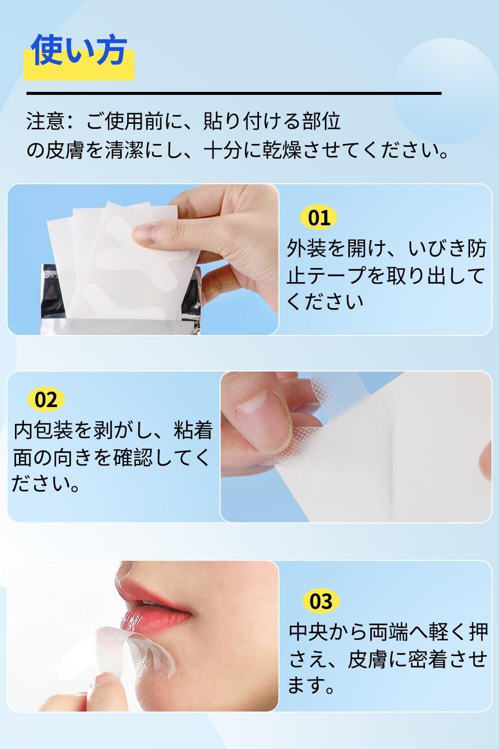 睡眠の質向上:口呼吸の持続は美容への悪影響にもつながります。いびき防止テープが就寝中に口を自然に閉じた状態をキープ。鼻呼吸をサポートし、毎朝スッキリした若々しい表情で目覚めを促します。