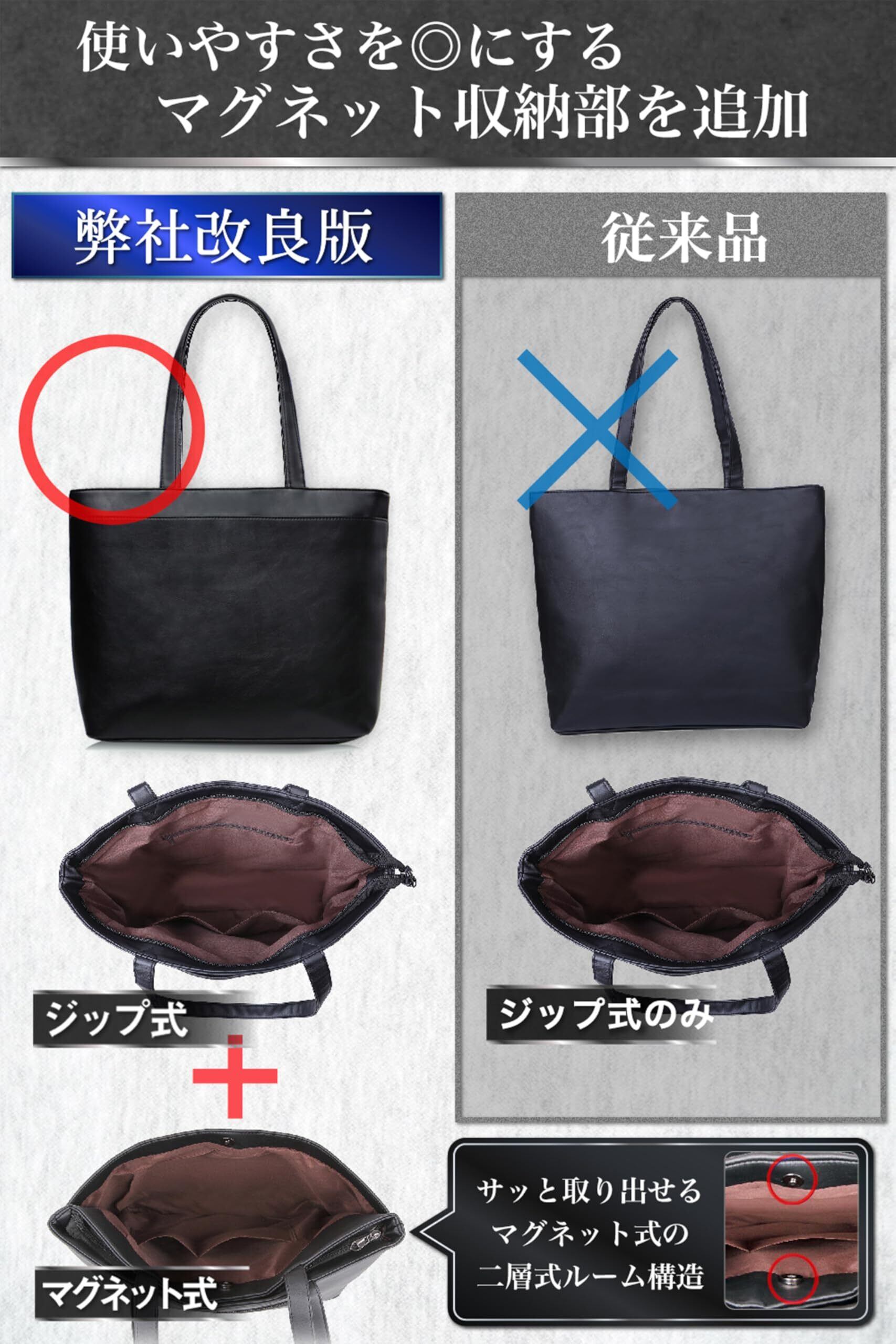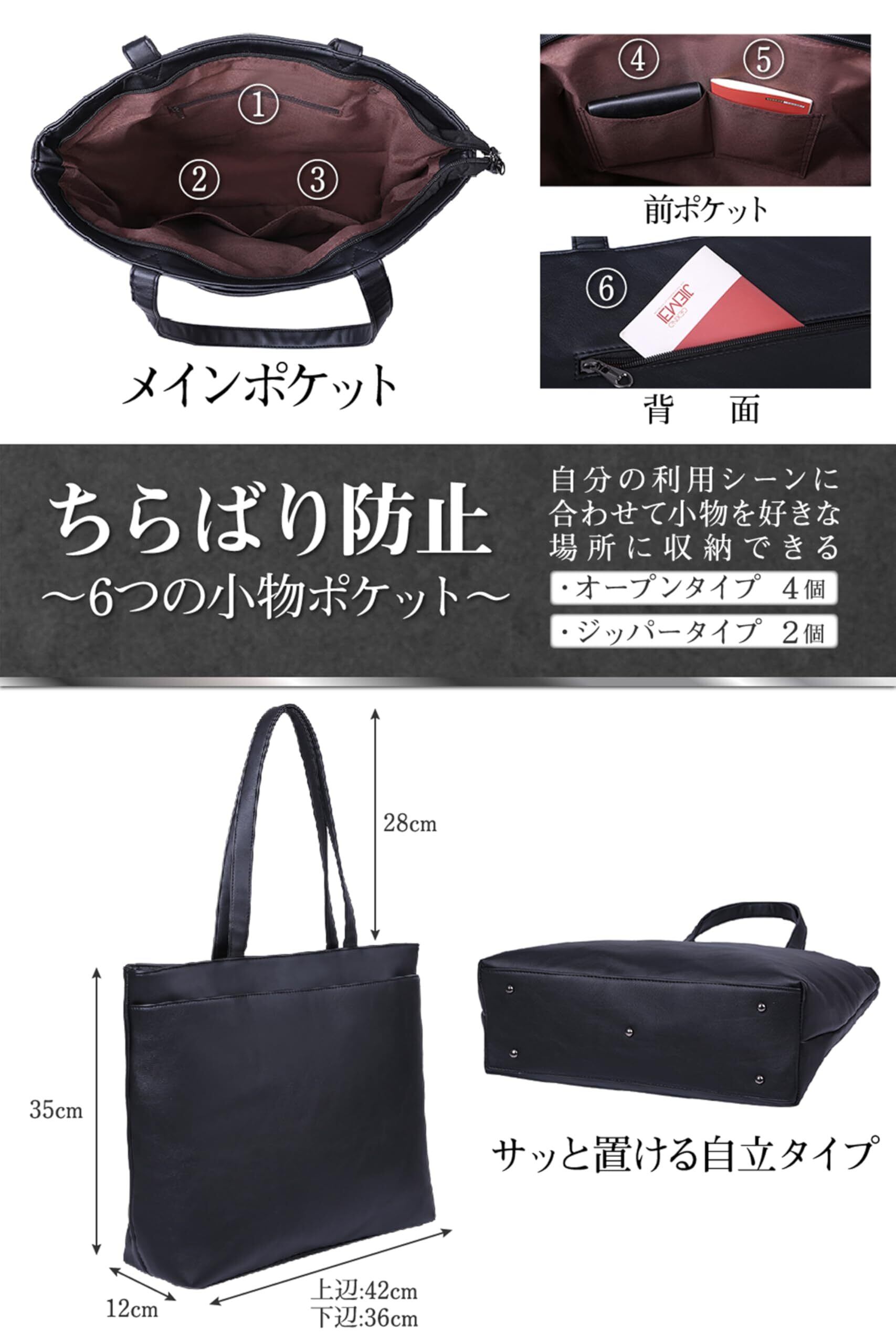 【辿り着いたオールマイティバッグ】定番トートバッグの形でありながらも利便性を重視し、トートバッグ前面には磁力式のフルサイズポケットを完備。大人びた雰囲気漂うスマートで主張しすぎないマットな風合いのシンセティックレザーで大人が持つべき秀逸なトートバッグへと仕上る。カジュアルなシーンであっても、商談などのビジネスシーンのビジネスバッグとしても利用することができるON/OFF兼用タイプ。底面には底鋲も付いており、汚れを気にせず自立バッグとして万能な活躍ができる。 【デザインを損なわない大容量タイプ】24時間365日使い続けることができる使い勝手の良い大容量タイプとなっている。A4サイズ、B4サイズの書類も折らずに収納することができる。パソコンはMacbook系、Windows系のノートパソコン16インチもしっかり収納できる。人間工学に基づき通勤でも使いやすい長めの手提げ紐にしたことで、トートバッグを身体の前後に持ってくることもできるので自分自身に合った持ち方を実現できる。 【職人品質の頑丈な耐久性バッグ】丁寧な裁縫仕上げによって丈夫で長持ちのするトートバッグ。パソコンや書類を大量に入れても安定して持ち運ぶことができる。小旅行や出張でも大容量タイプのため書類や着替えを入れても安心して移動できる。 【洗練されたシンセティックレザー】光沢を抑えて上品さを求めたシンセティックレザートートバッグ。コードバン革のような光沢の強い生地を利用せずに、あえて主張しすぎない小粋なバッグ。懐かしさと今っぽさを共存させた品のある風合いを印象づけることができる。 【機能美を追求したマグネット式ポケット】利便性とシンプルな外観を維持したスマートな前面の磁力式フルサイズポケット。ビジネス利用時には、定期券を入れることやタバコや名刺などのビジネス小物入れとして活躍する。自動車通勤でもサッと必要なモノを取り出すことができる。もちろん通常利用できるメインポケットはジップ式で防犯や外見え防止効果もある。さらにはマグネット式ポケット内には2つのオープンポケットもあるので散らばり防止もできる。