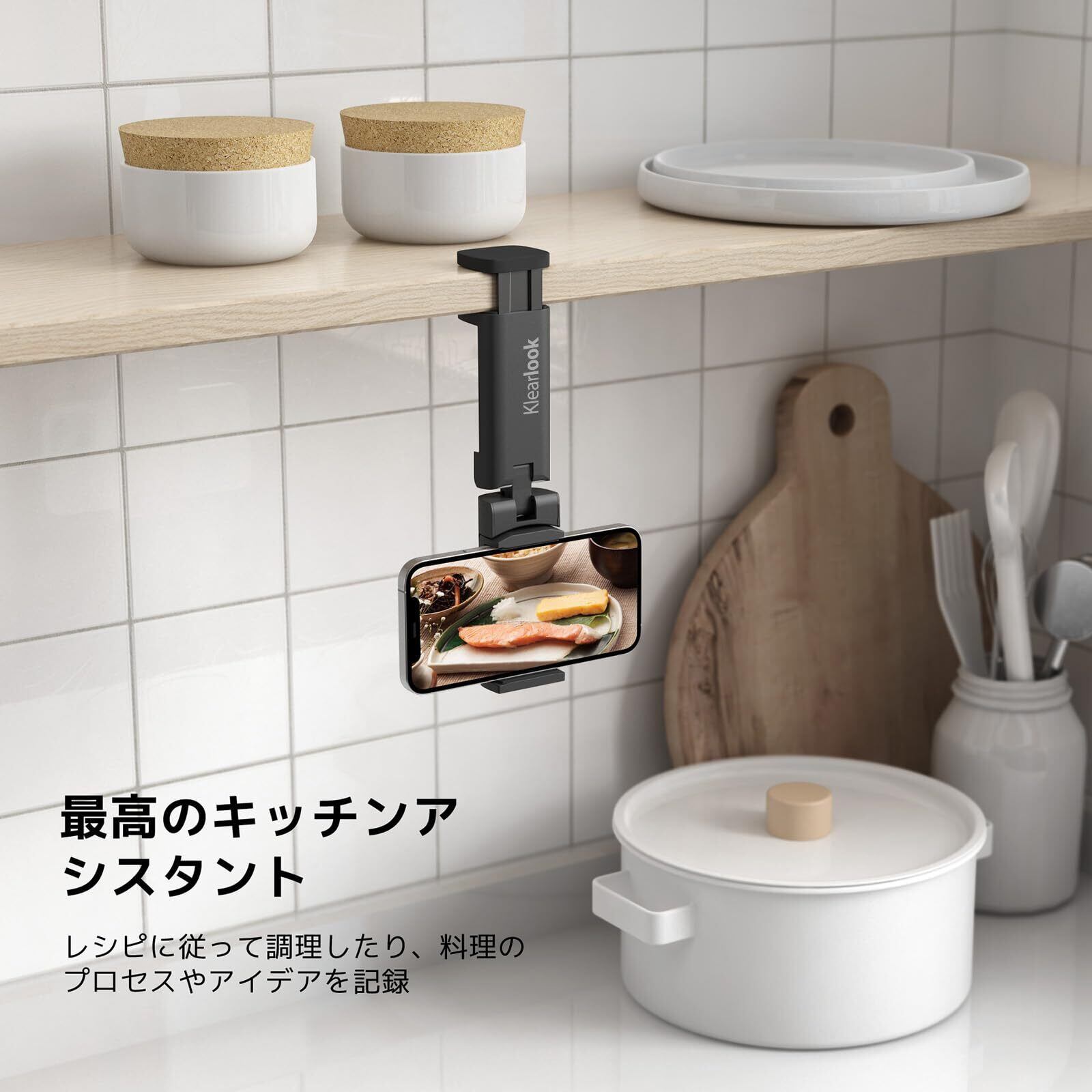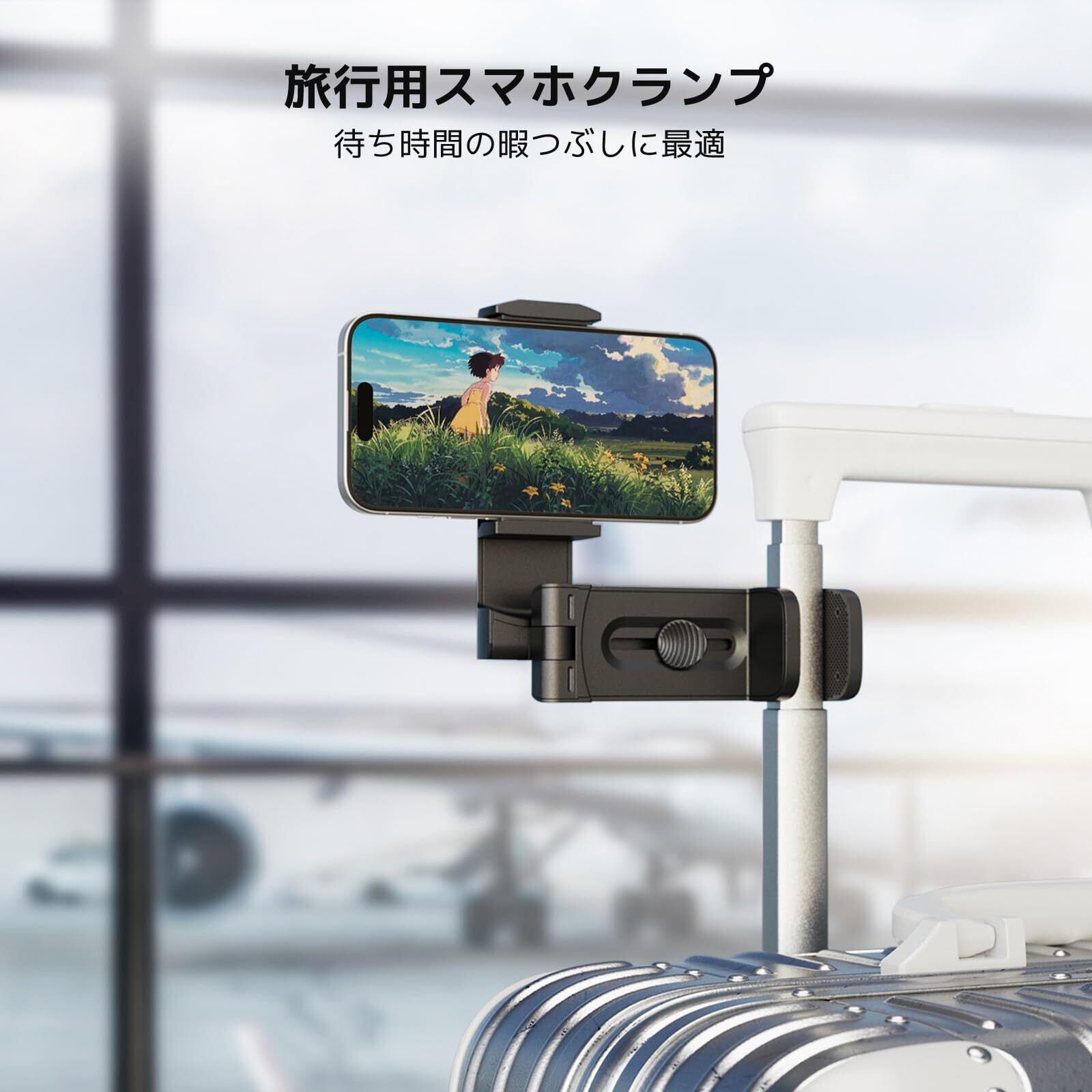 【各場所で大活躍スマホホルダー】卓上、デスク天板の端、飛行機客室の折りたたみ式トレイ、スーツケースのキャリーバー、どこでも設置可能です。オフィス、ベッドサイド、キッチン、ジム、ホテル、車内などの場所で、両手を解放して自撮り、動画視聴、ビデオ通話などを楽しみます。