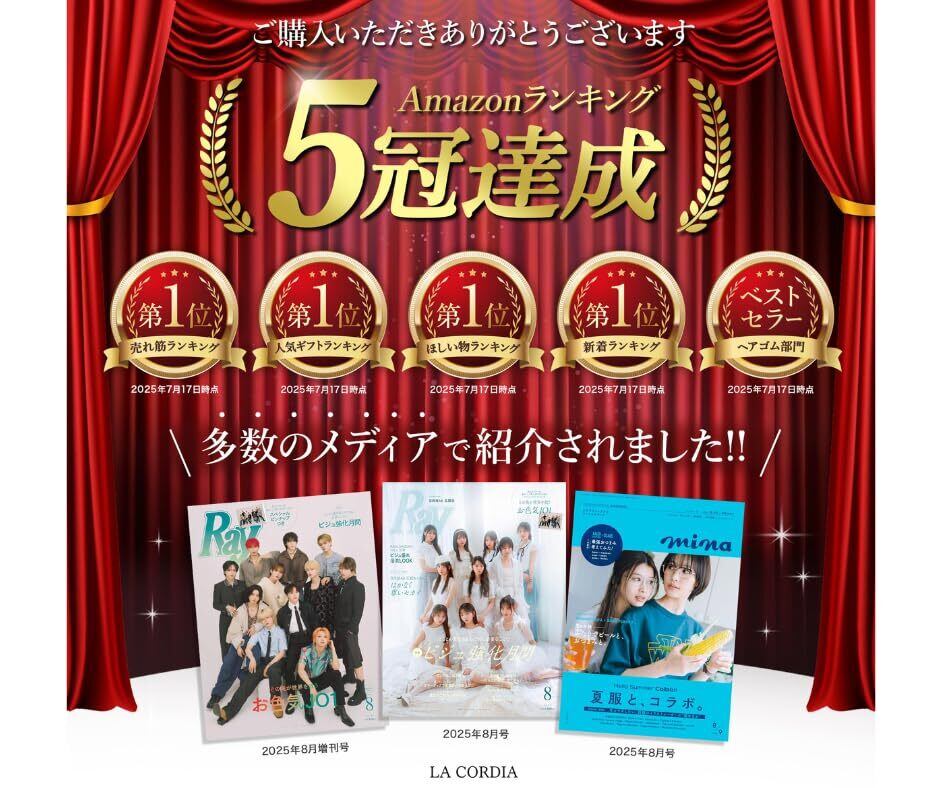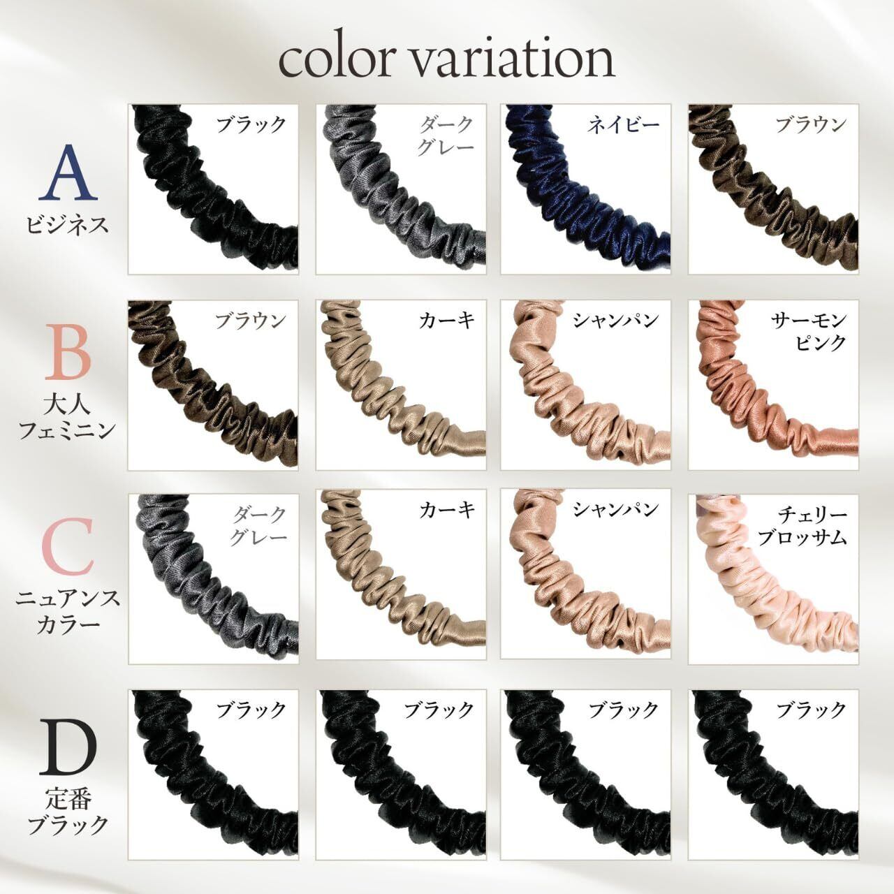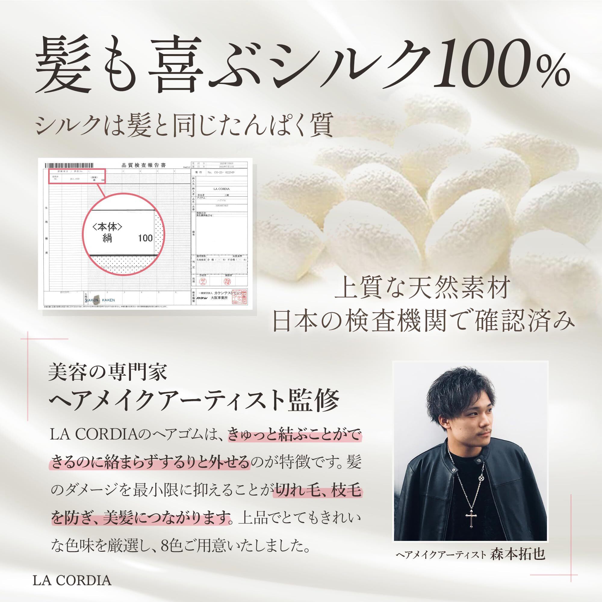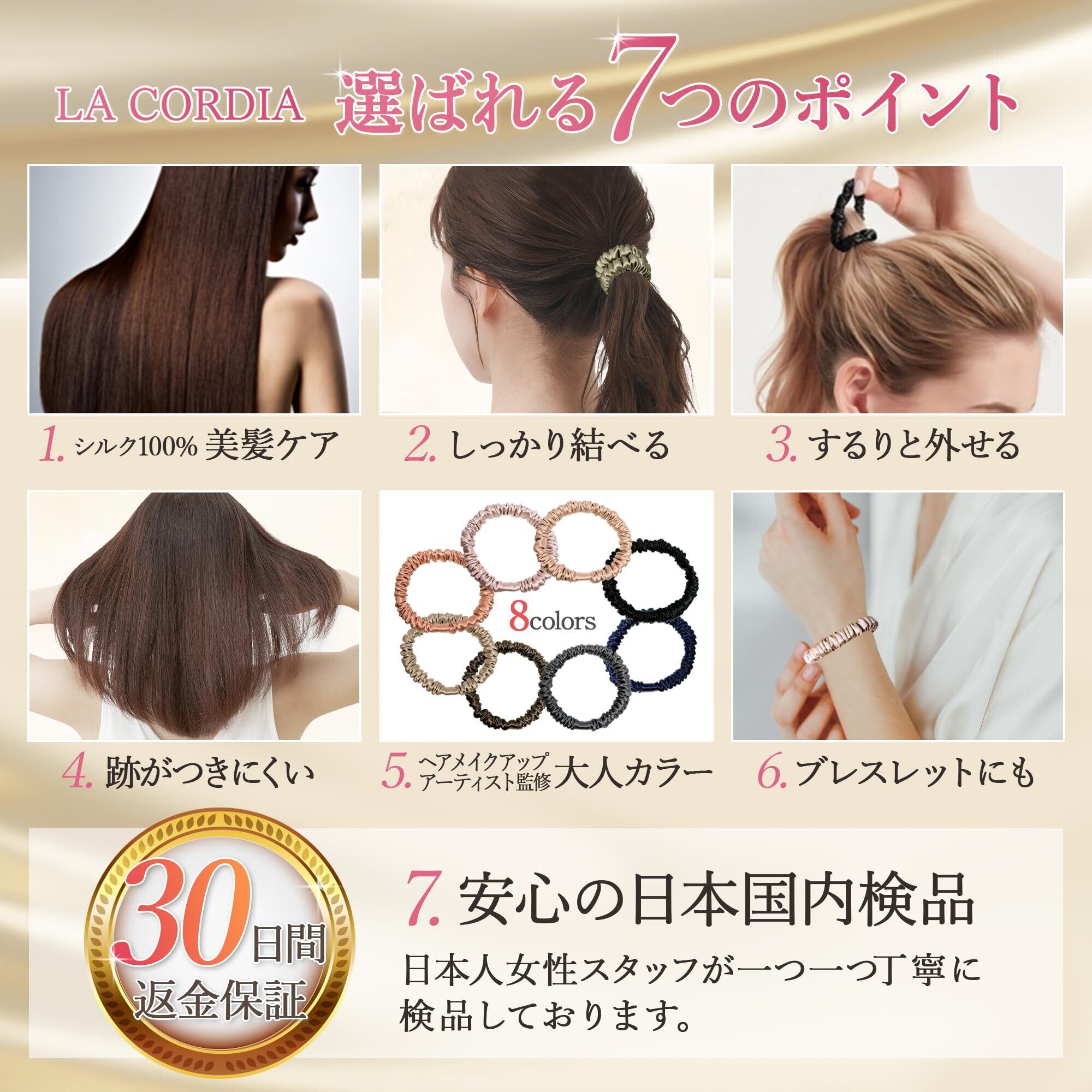 ①髪を守り、美髪へ導く ②しっかりキープして落ちてこない ③するりと外れるから抜け毛・切れ毛を予防し絡まらない ④跡がつきにくい ⑤ヘアメイクアーティスト監修カラー ⑥手首に付けてもおしゃれ ⑦日本国内で一つ一つ丁寧に検品・梱包