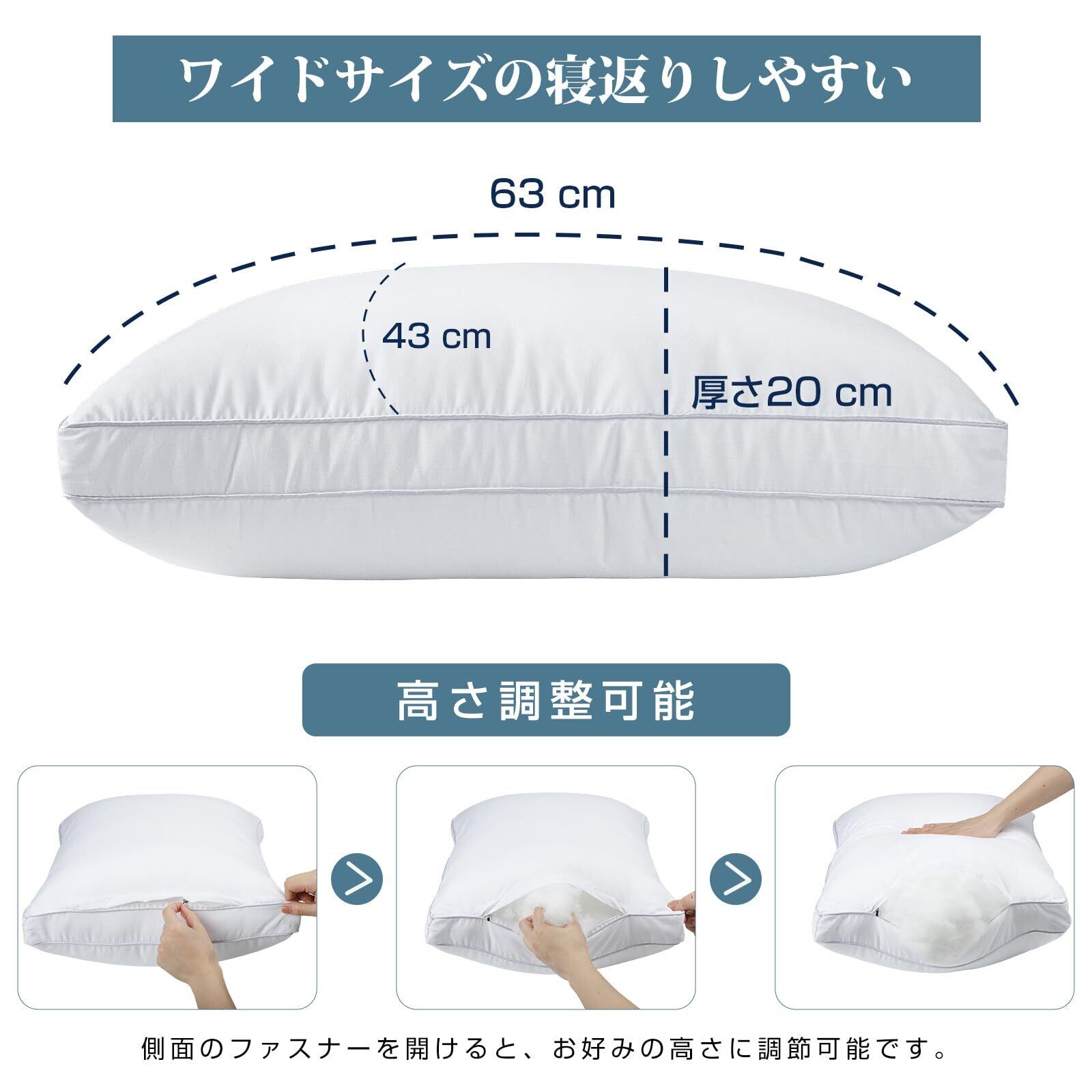 枕 まくら 高級ホテル仕様 首が痛くならない 安眠枕 横向き寝 低め 高め 快眠枕 丸洗い可能 高さ調整 ふわふわ 立体構造 通気性 pillow プレゼント63x43x20cm (ホワイト)