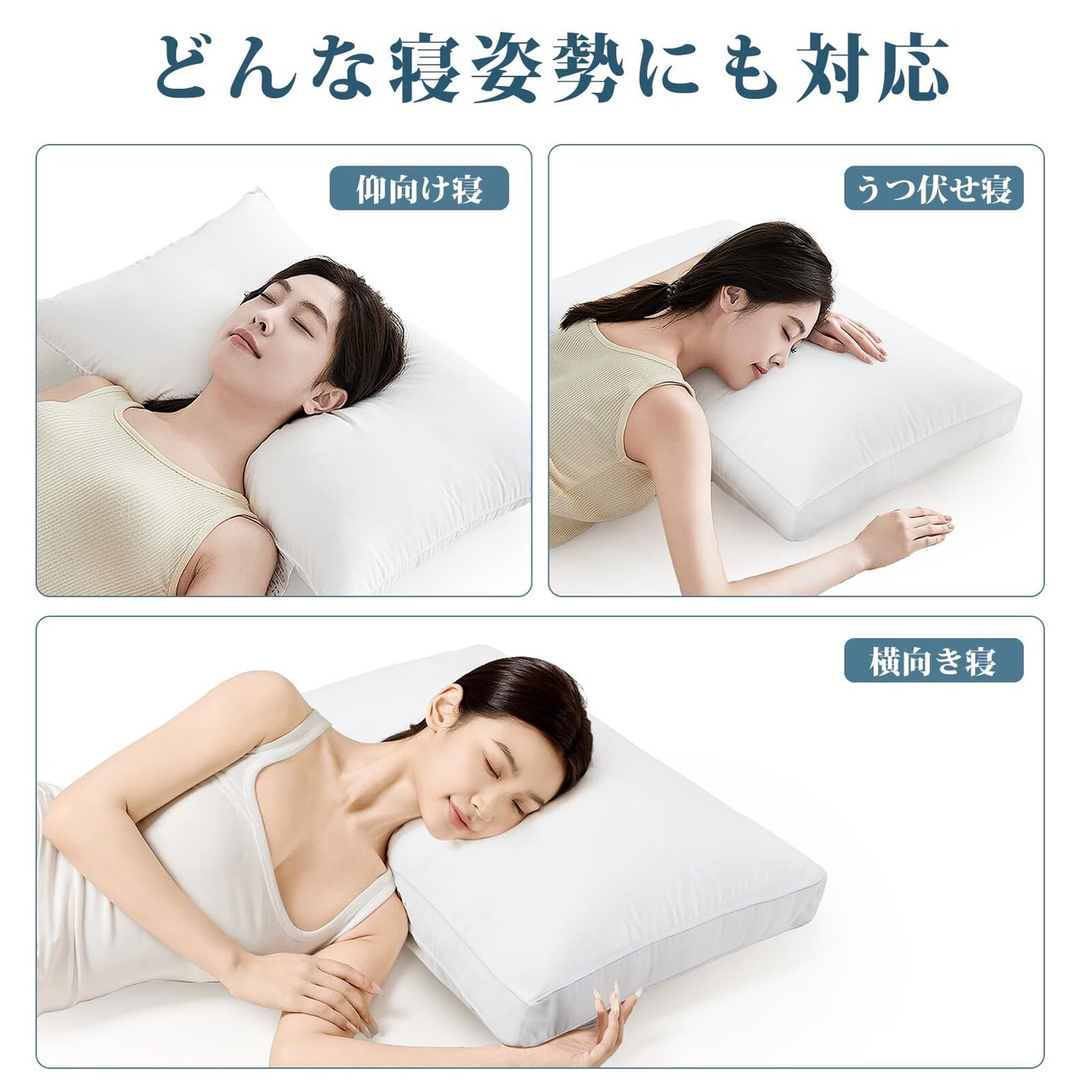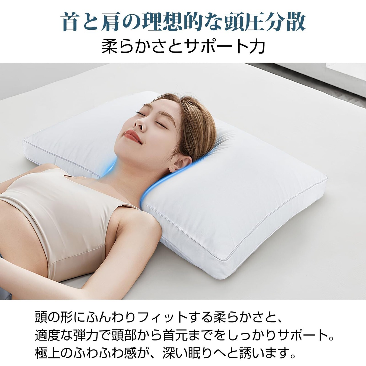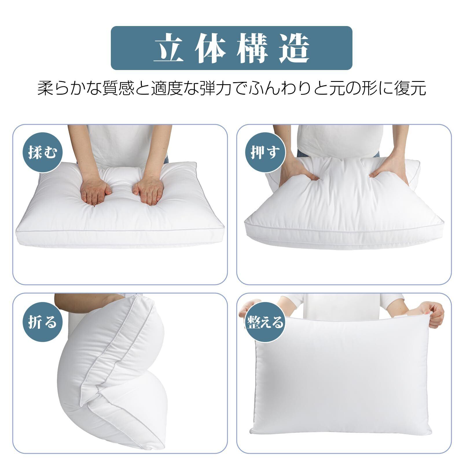 【立体構造】側面には型崩れを防ぐマチ加工を採用。ふんわりとした柔らかさと適度な弾力性を備えた立体構造により、首や肩の負担を軽減する適度な硬さが両立しているため、寝返りを打っても快適な姿勢を保てるのです!仰向け寝・横向き寝・うつ伏せ寝、お好きな寝姿でぐっすり眠れます。