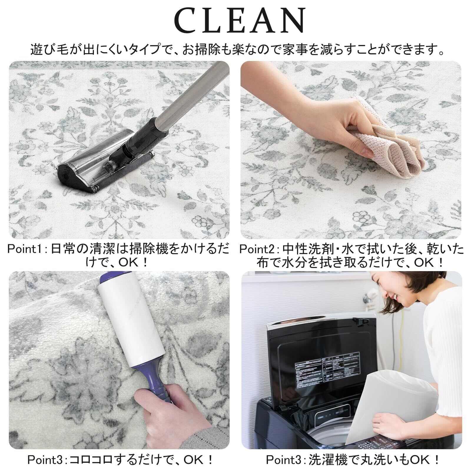 【お手入れ便利】毛足がないので、ゴミが絡みにくく、日常の清潔は粘着クリーナーをコロコロするや掃除機をか けるだけでキレイになります。また、汚れた場合は手洗いや洗濯ネットに入れて洗濯機で洗うことができます(ご 注意:風通しの良いところで陰干しし、アイロン、乾燥機の使用をお避け下さい。)