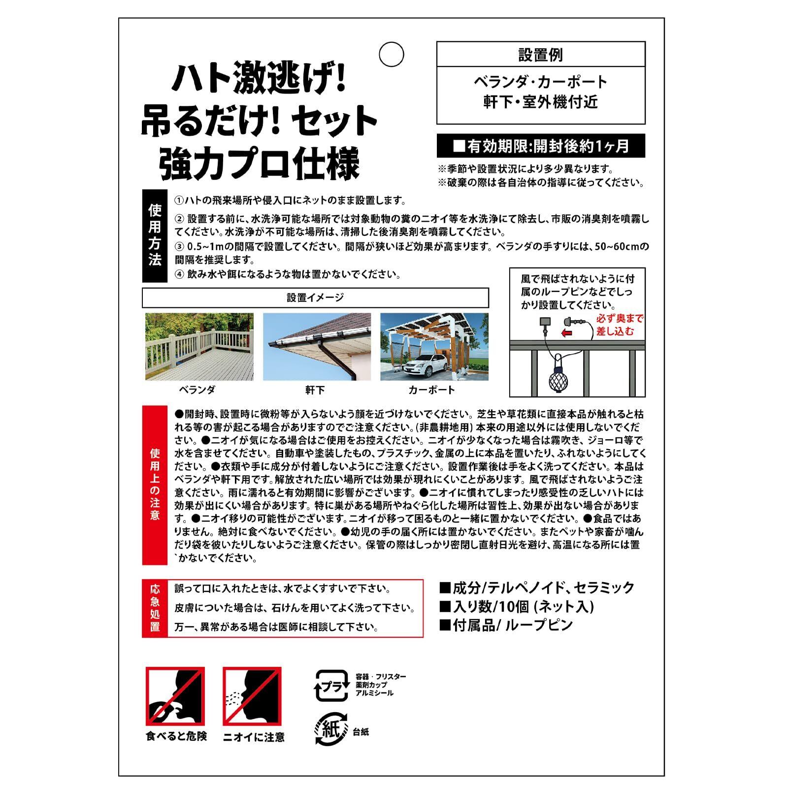 【吊るだけ簡単・適用箇所】ハトの飛来場所や侵入口にネットのまま設置します。ベランダ・軒下・ガレージに吊るすだけ,誰でも・簡単に・すぐ設置できます。固形の鳩よけグッズなので、ハト激逃げ効果の持続時間が長くなり、雨風にも強く効果・持続性がケタ違い。テープなどを貼る必要もなく、手すり・床がベタベタ汚れません。設置時に便利なプールロックが10本付いています。※ ※ ※設置場所の広さに合わせ適当な数量を設置。設置する前に、水洗浄可能な場所では対象動物の糞の二オイ等を水洗浄にて除去し、市販の消臭剤を噴霧してください。水洗浄が不可能な場所は、清掃した後消臭剤を噴霧してください。
