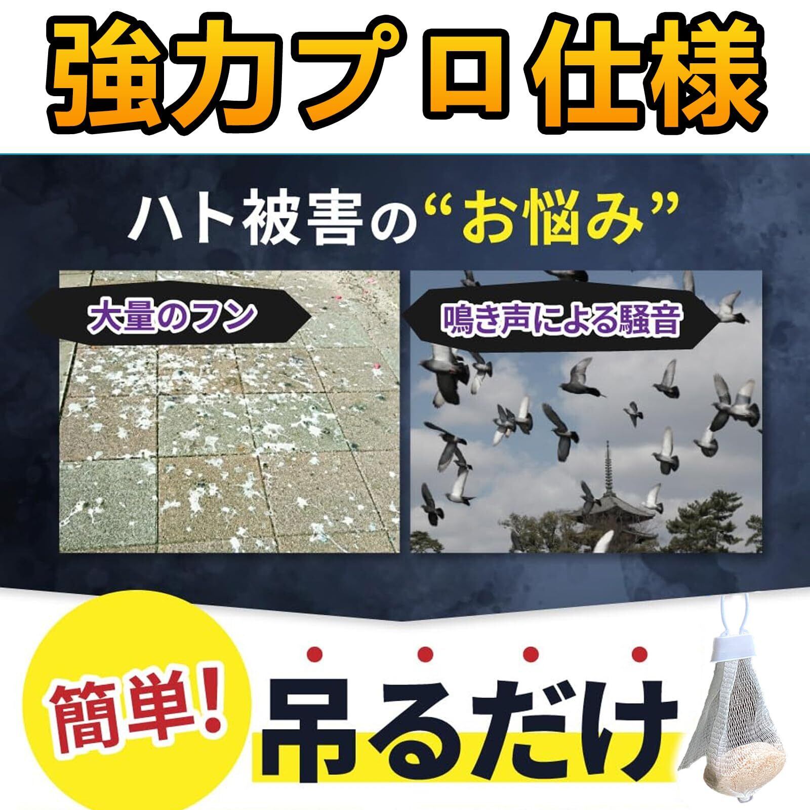 【鳩よけグッズ 屋外】简単な置きだけで、ハトを駆除できる制品です!殺ハトではなく、鳩が自ら去ってしまう環境を作ります。においでハトを追い払え!実験室でテストしたところ、本能レベルで嫌う「ミントの香り」で鳩を撤退。ハトはミントの香りを毒だと勘違いし、恐れる本能があります。ハト対策なので簡単に置くだけで駆除できます。忌避実験でしっかり効力が認められた、鳥用に開発された強力な鳥よけグッズです。※ ※※室内やベランダで使用されるときはお皿等に入れてください。水に濡れた場合、成分が付着することがあります。