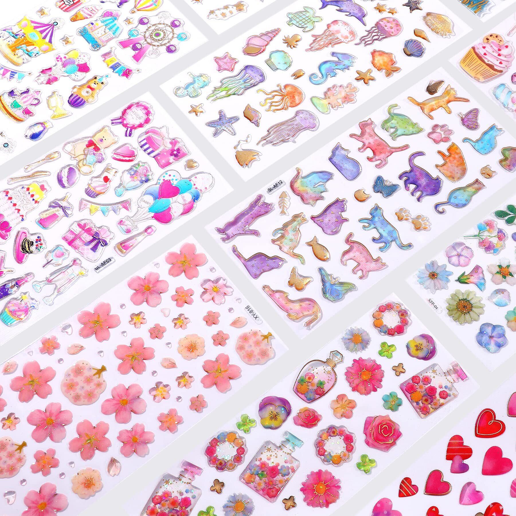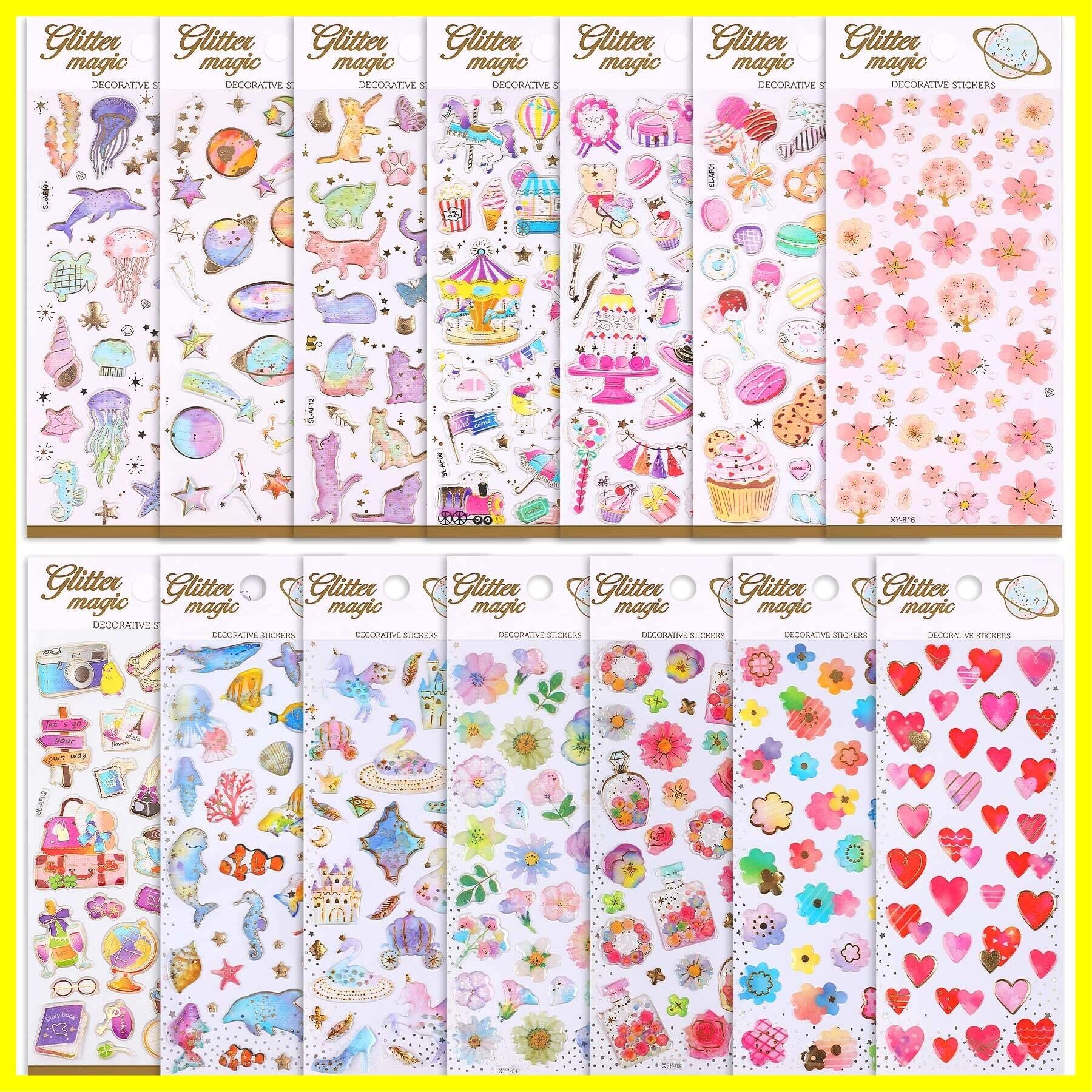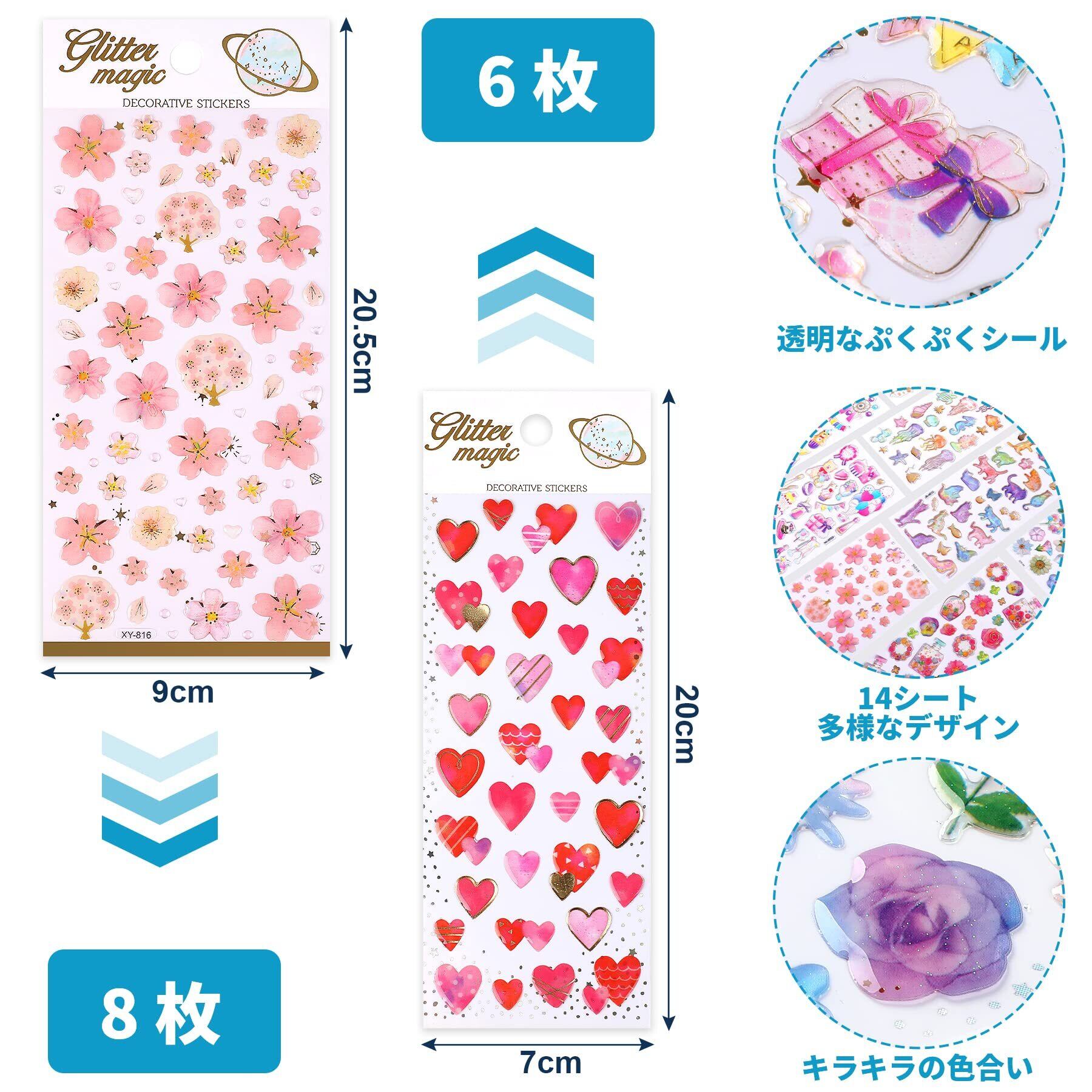 SANNIX キラキラシール 女の子 14シート ごほうびシール 手帳ステッカー ぷくぷく シール キラキラ ハート 立体 デコ ステッカー ごほうび スケジュール帳 星花と貝殻クラゲ