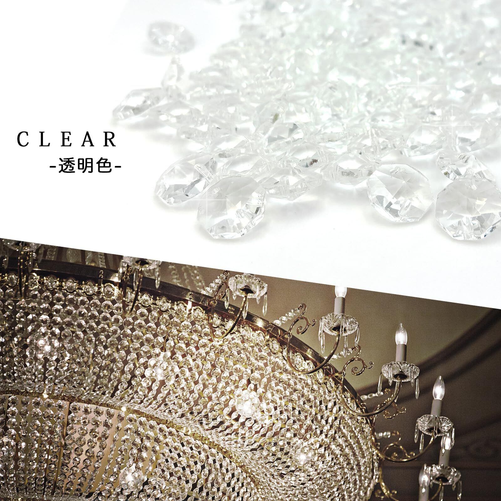14mmの八角形クリスタルガラスを採用しており、高級感ある光沢が特徴。ゴールドリングとセットになったタイプもあり、照明装飾やデコレーションに幅広く使えます。クリアカラーで、100個・300個・500個・1000個セットといった豊富なバリエーションが用意されており、用途に応じて選べます。