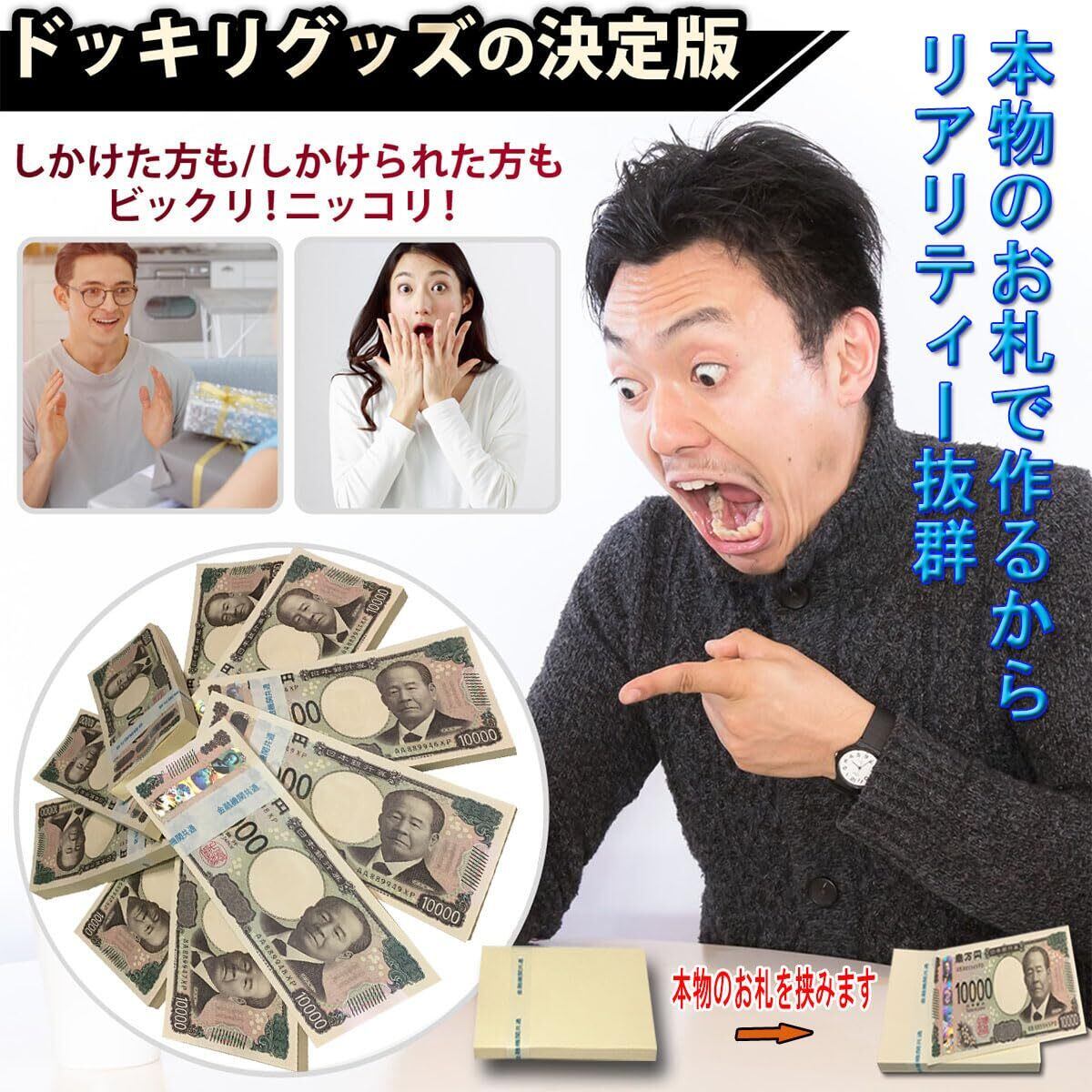 ドッキリ札束、1束100枚が10束入り1000万円分のダミーが作れます。本品は印刷なしの無地の紙束です。※本物の1万円札をご用意下さい。金運アップ、誕生日、SNSなどアイデア次第で遊び方は無限大です。