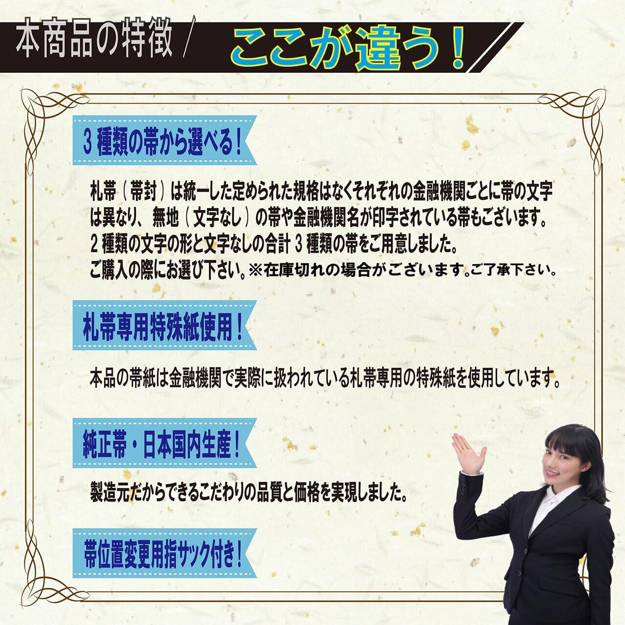 札帯(帯封)は統一した定められた規格はなく、金融機関ごとに帯の文字は異なり、無地(文字なし) の帯や金融機関名入りの帯もございます。「金融機関共通」太字文字入り、帯取り付け済み。