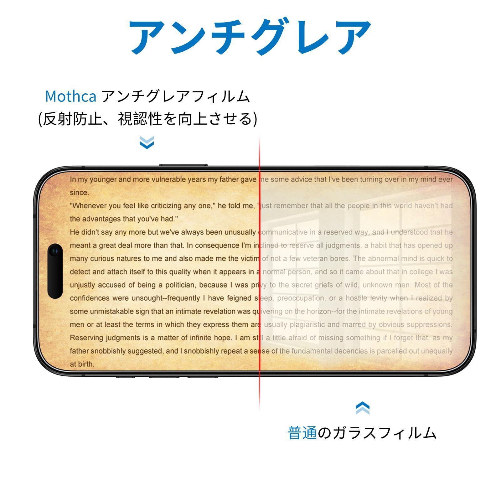 Mothca アンチグレア iPhone 16/iPhone 15対応 ガラスフィルム 強化ガラス 保護フィルム サラサラ タッチ感 ゲームフィルム ガイド枠付き 液晶 日本旭硝子製素材 指紋防止 反射防止 硬度9H 飛散防止 キズ防止 衝撃吸収 撥油性 疎水 アンチグレアフィルム