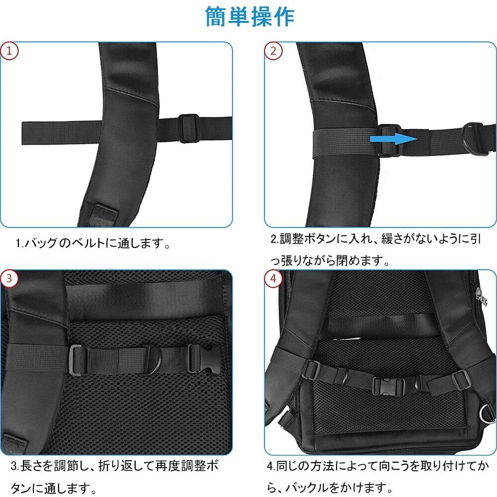 1. バックルを使って簡単に取り付け・取り外しができます。2. リュックの肩ベルトに装着し、長さを9.8-27.5インチの間で調整してください。3. バックルをカチッと留めて固定します。