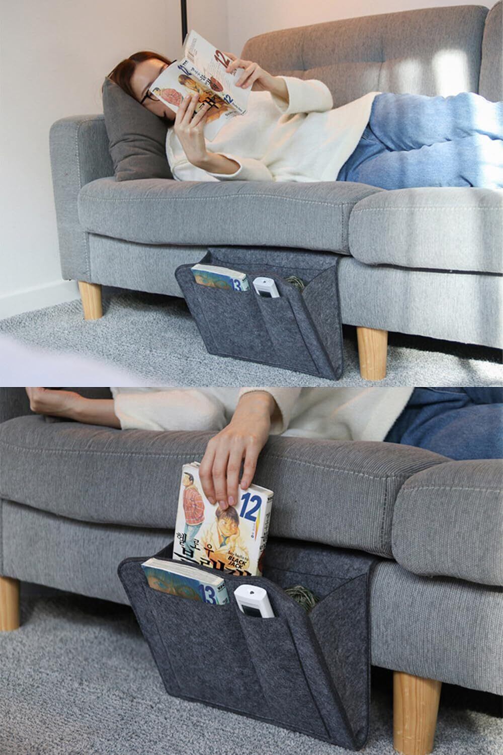 大きなポケットにはタブレットや本などを収納できます、4つの小さなポケットには、携帯電話やリモコンなどの小物を入れることができます。