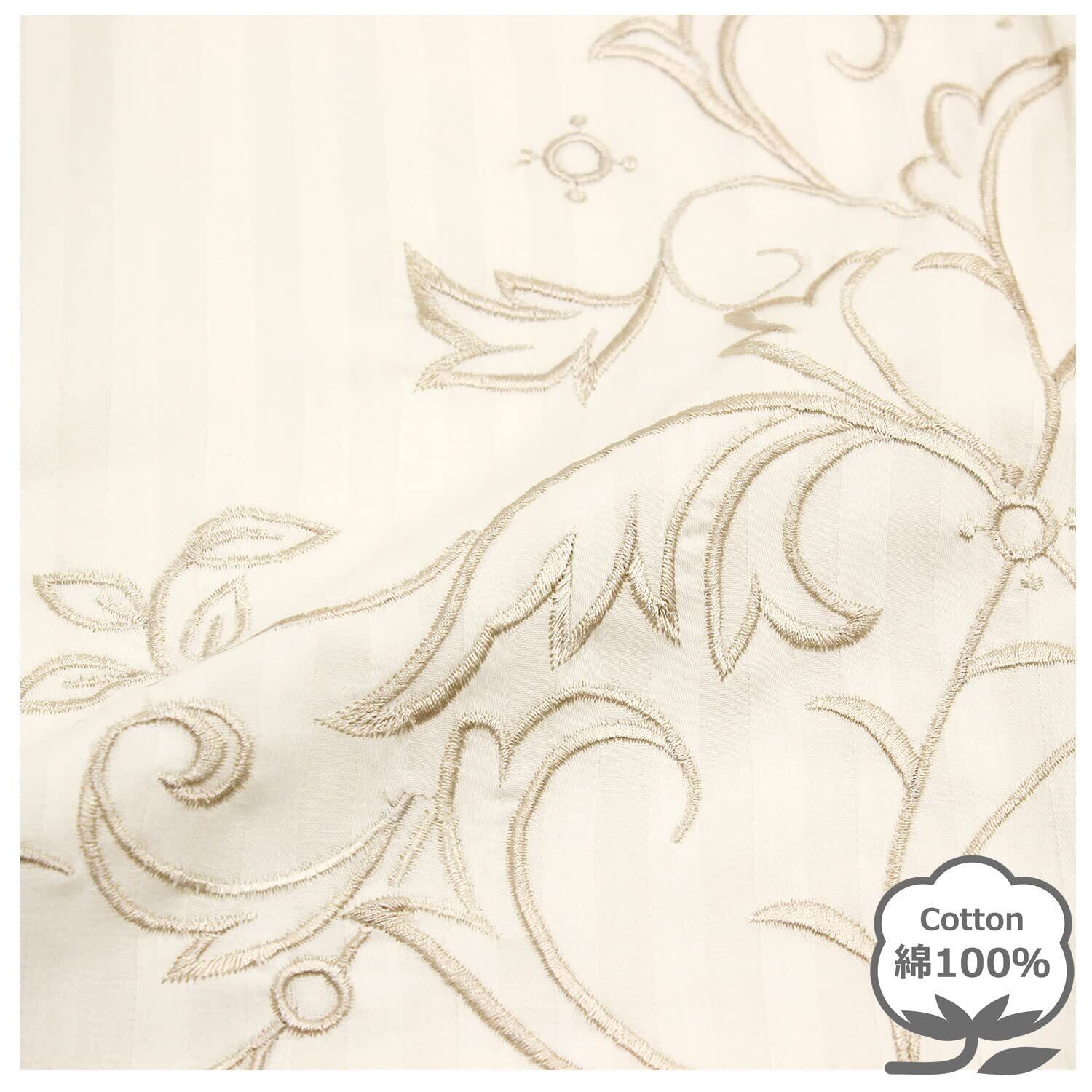 サテンストライプに刺繍を施し、上品で繊細なイメージの枕カバー。高密度な刺繍には光沢があり高級感があります。サテンストライプの特長でもある上品な光沢感と滑らかな肌触りがラグジュアリー感のあるベッドルームを演出。綿100%の生地を使用し保湿性、吸水性に優れているのでオールシーズン快適にお使いいただけます。