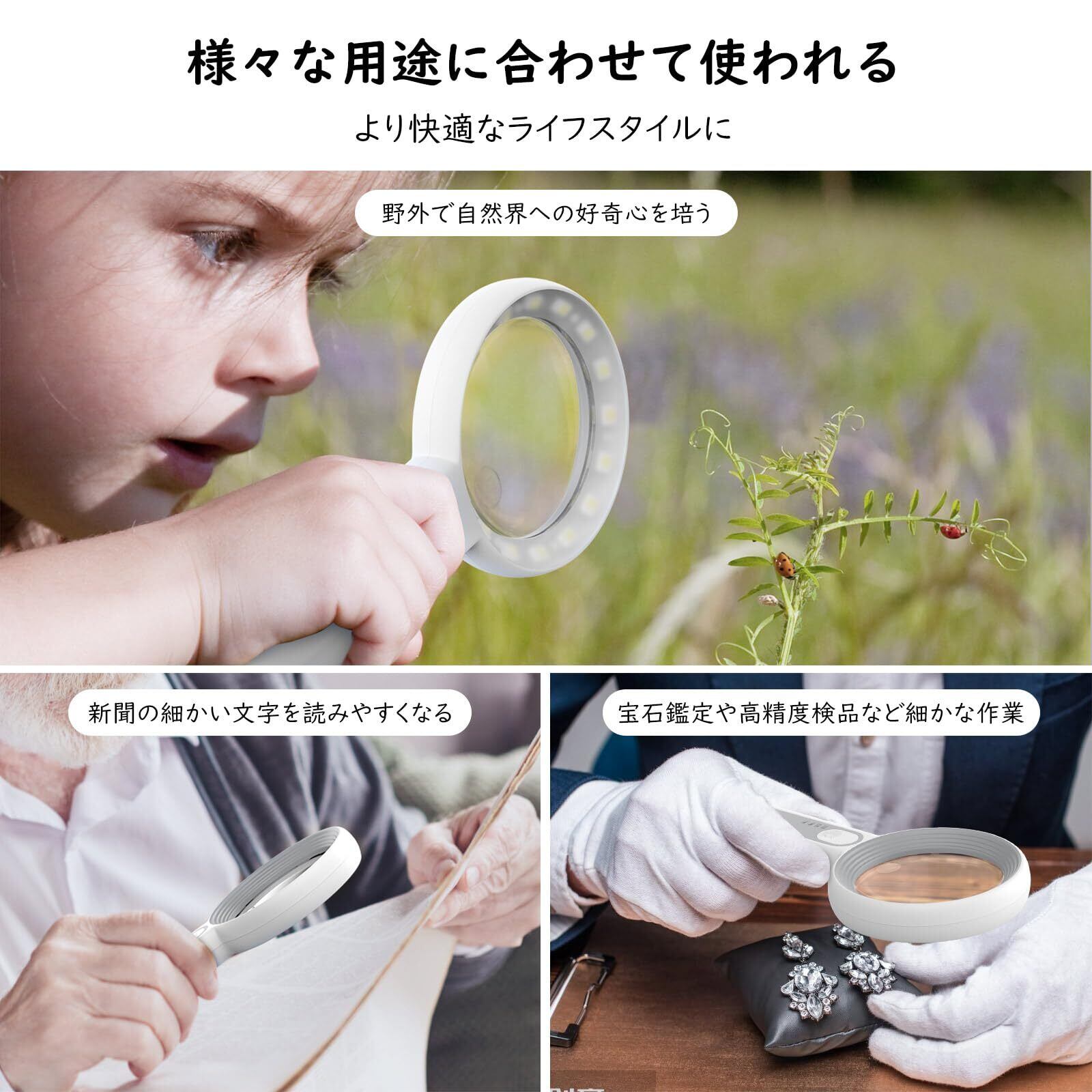 「実験や観察に適した2種高倍率」野外での昆虫や植物観察には適した内径60mmありで、6倍の高倍率持ちの仕様より、細かいピントの調整などをする必要がなく、観察したい部分だけをピンポイントで大きくすることができます。更に宝石鑑定や高精度で観察や検品に適する12倍率に達した小型レンズがメインレンズについてあり、倍率が異なった2in1のレンズ仕様より見るモノに合わせて気軽にご利用いただけます。