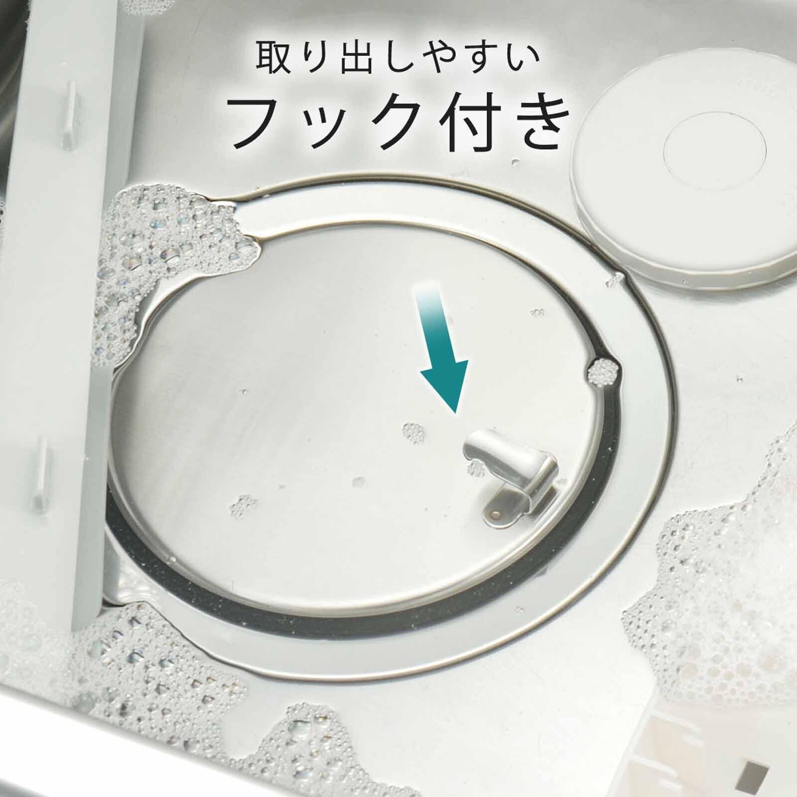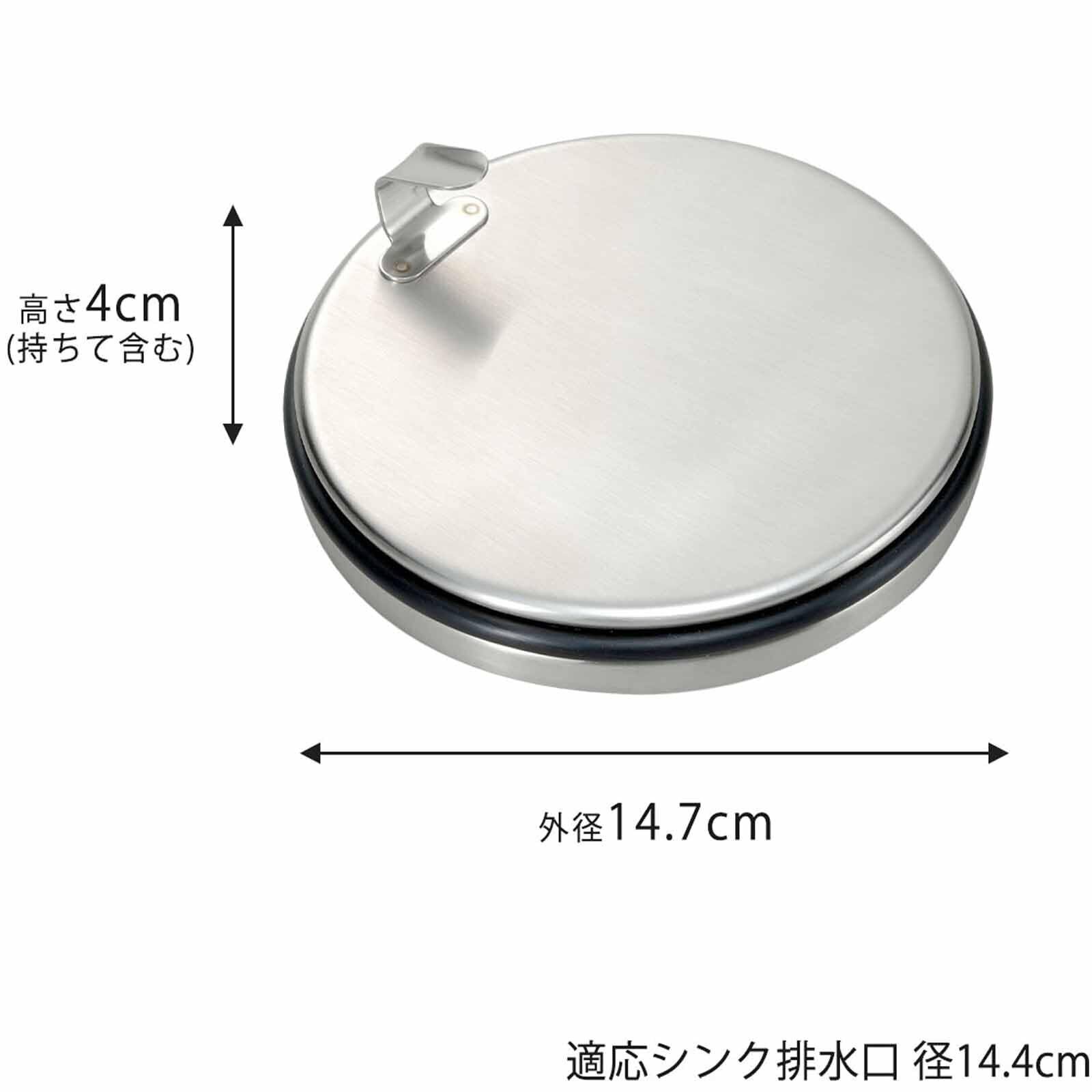 サイズ(約):外径14.7×高さ4cm(持ち手含む)、適応シンク排水口内径14.4cm
