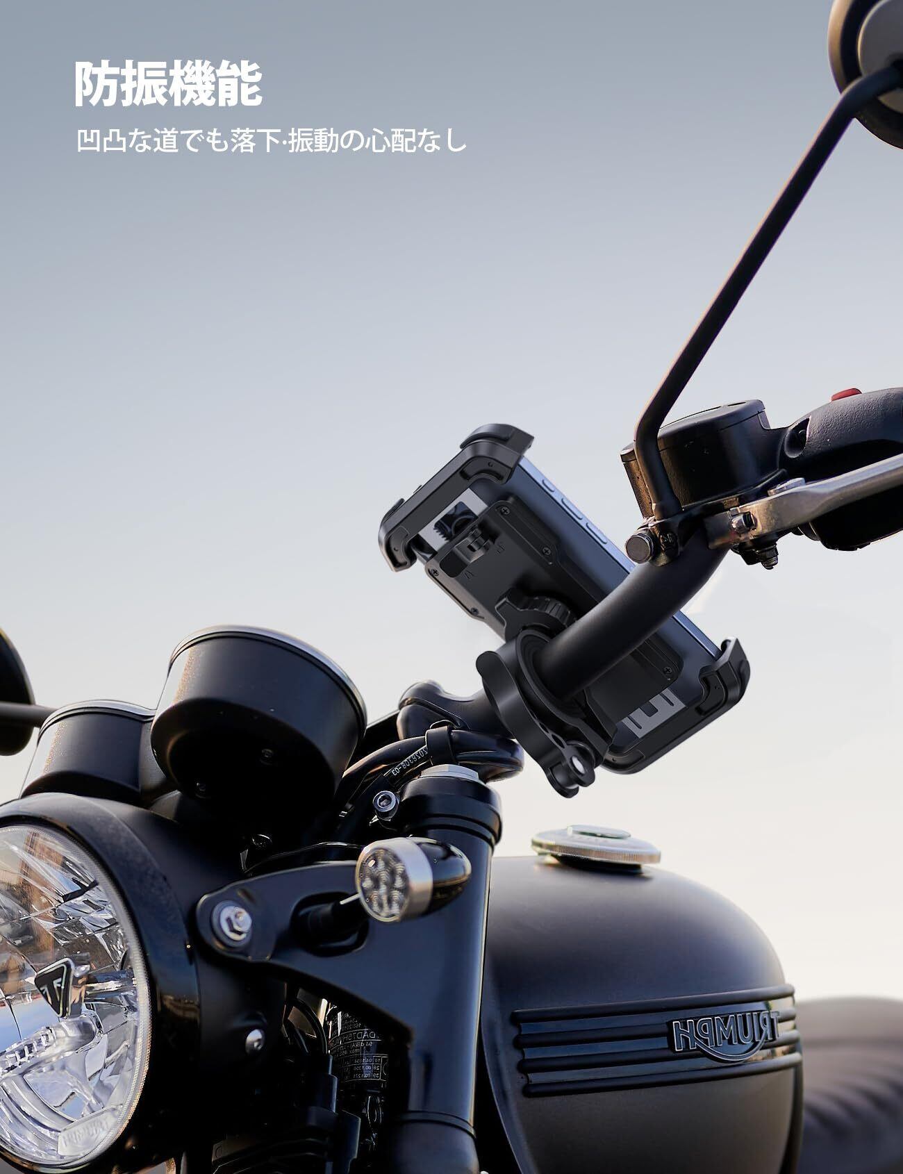 【落下防止ロック】使い勝手がよいロックが設置され、強い振動でもスマホをしっかりホールドできます。また、スマホの四隅のかわりに、スマホをオールカバーするデザインは、スマートフォンをガッチリと固定できます。