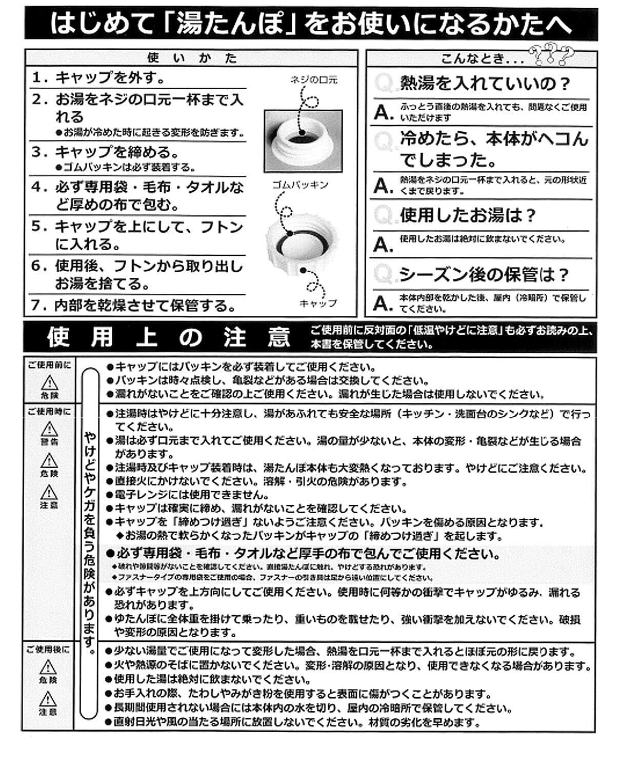 ●湯たんぽは経済的で優しいぬくもりが魅力の暖房器具ですが、使用方法を誤ると大事故や大けがにつながる危険があります。ご使用前には必ず取扱説明書をよくお読みになり、十分に理解したうえでご使用ください。また、読み終わった説明書は必要な時にいつでも確認できるよう、大切に保管して下さい。