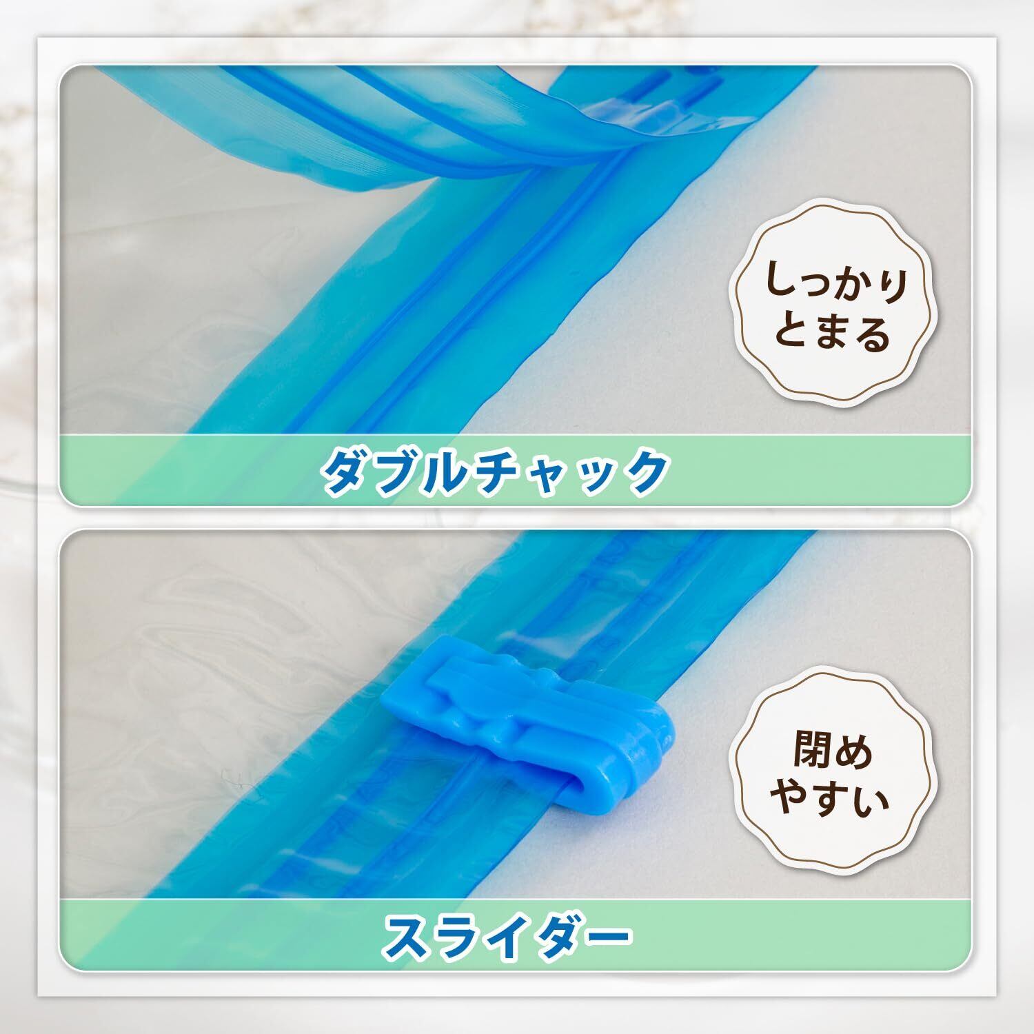 ●空気漏れを防ぐ二重チャック構造+専用スライダー付きでしっかり密閉。