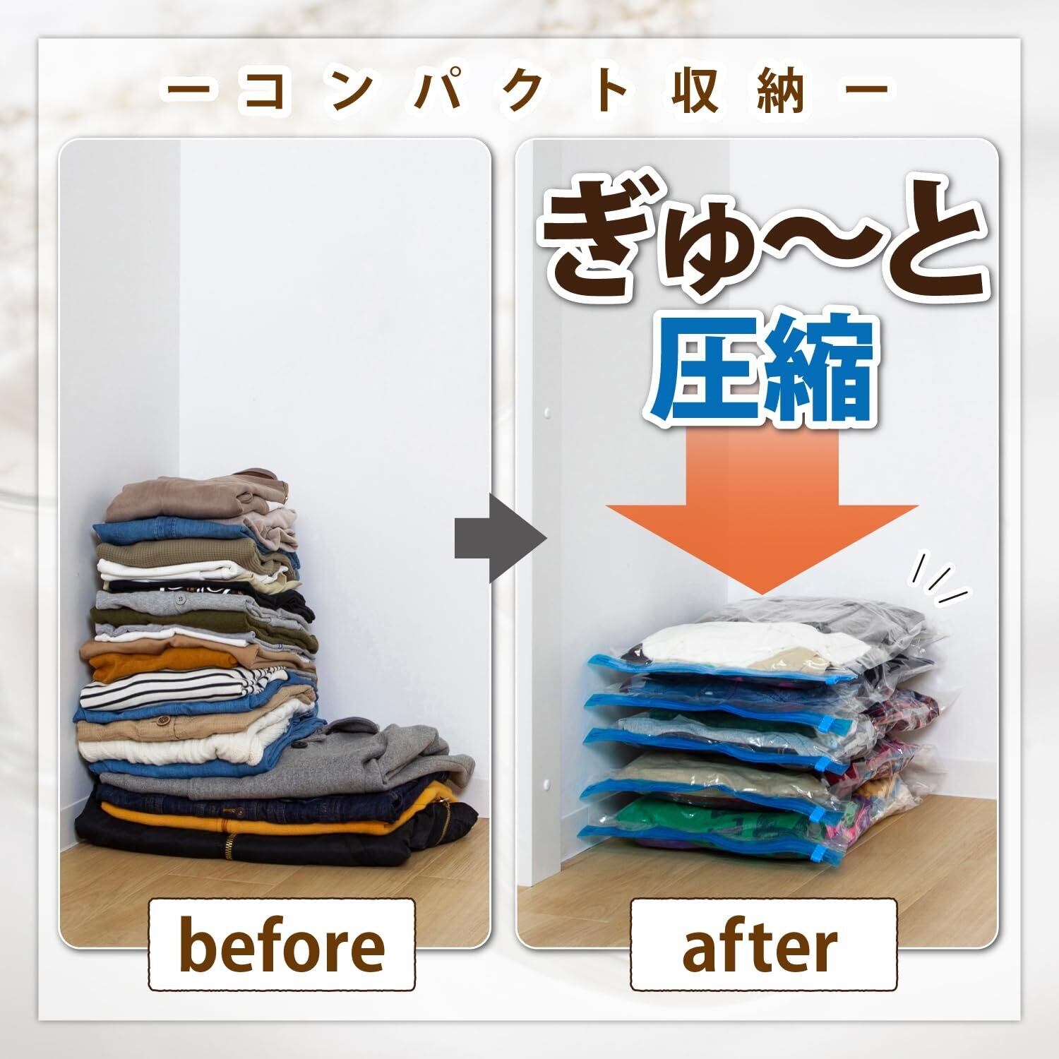 【商品仕様】:サイズ/約40×60cm、内容/5枚組、収納目安(圧縮袋1枚あたり):薄手シャツなら約7~10枚、厚手セーターなら約2~3枚、バスタオルなら約1~2枚