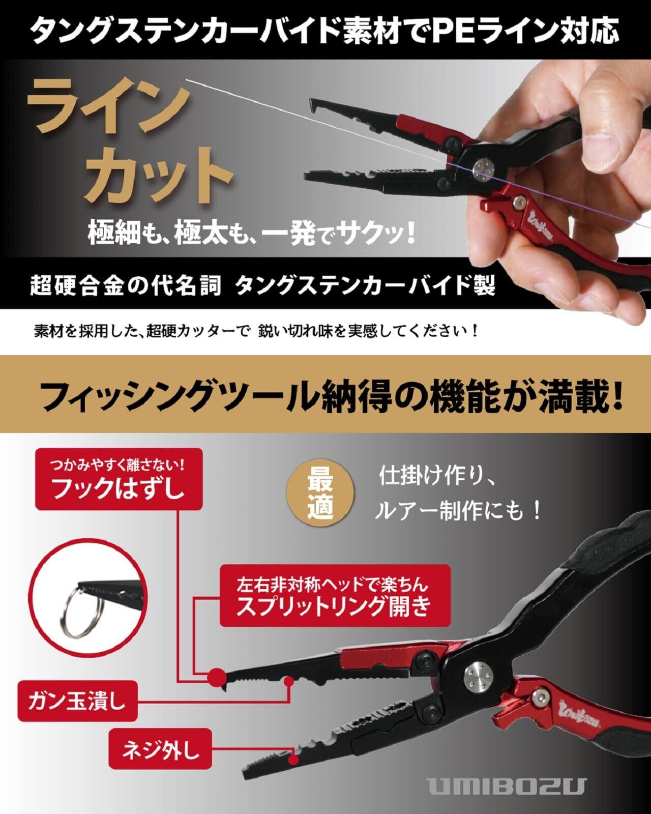 【充実の機能】スプリットリング外し、オモリ潰し、ラインカットなど多機能を備え、タングステンカッターはPEラインも楽々カット。カラビナロープも付属してます(対応スプリットリング#3〜推奨)。