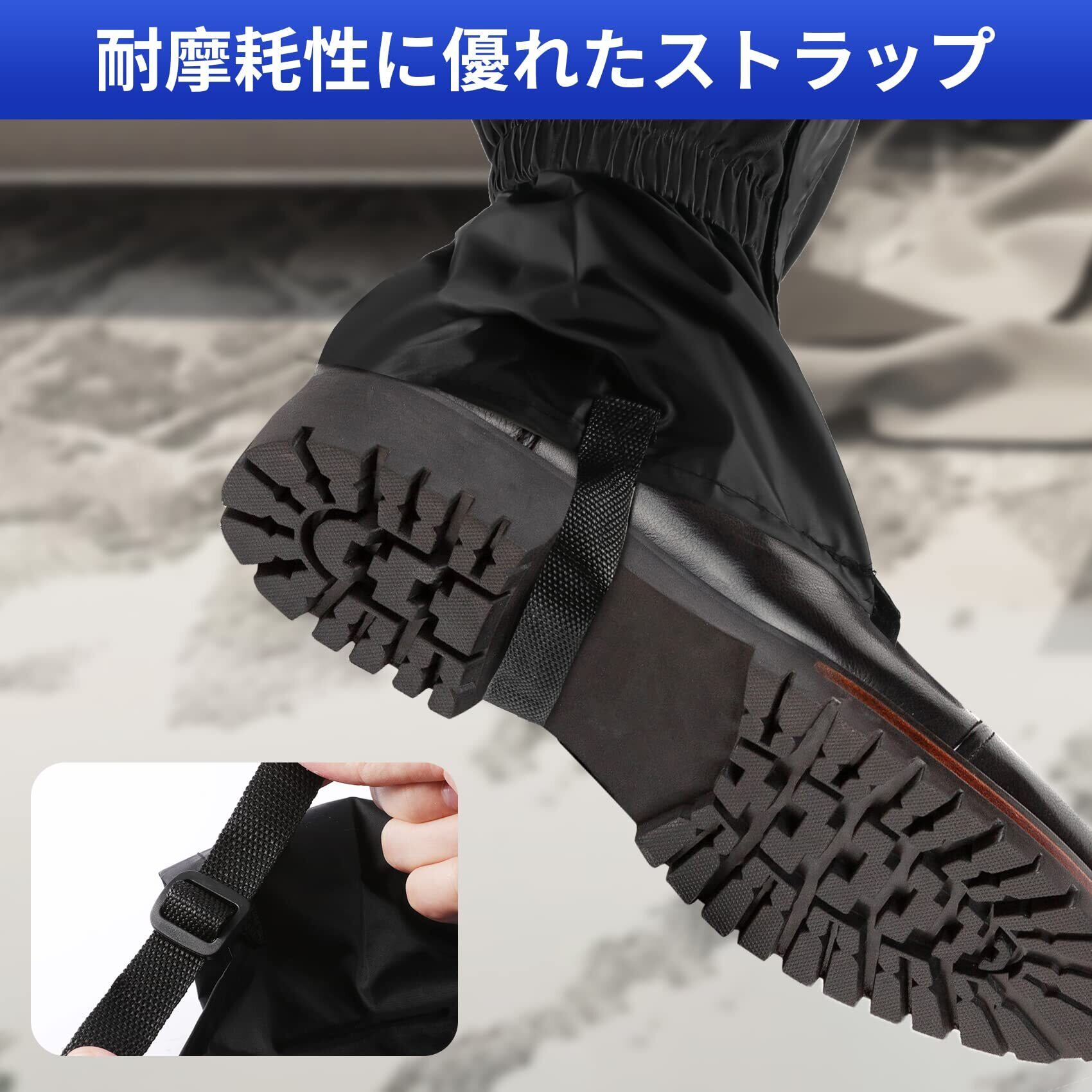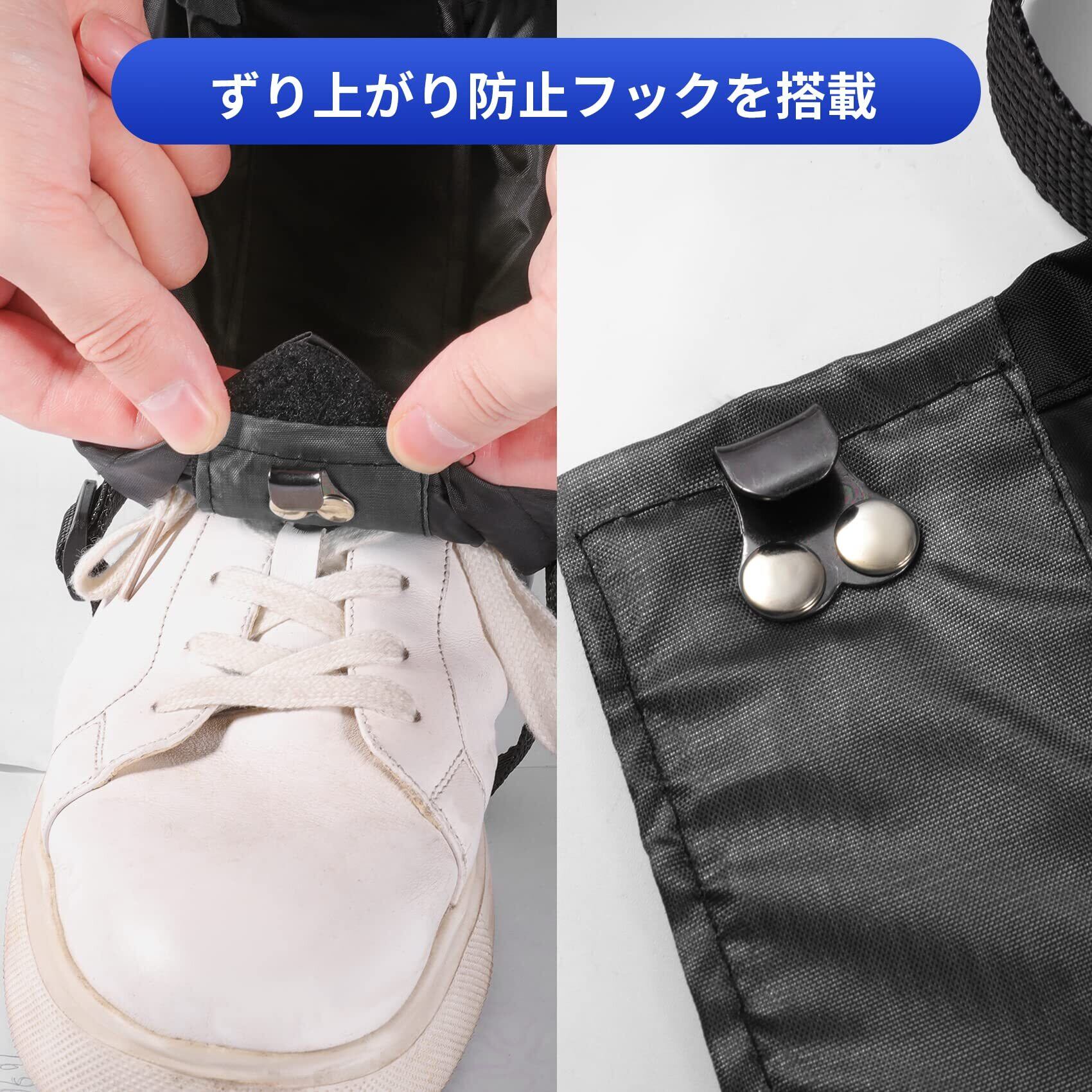 二重固定:登山靴カバーの底部には強化ベルトと金属フックを装備。靴紐に引っ掛けてズレを防ぎ、歩行中も安定。軽登山やトレッキングで足元をしっかりサポートします