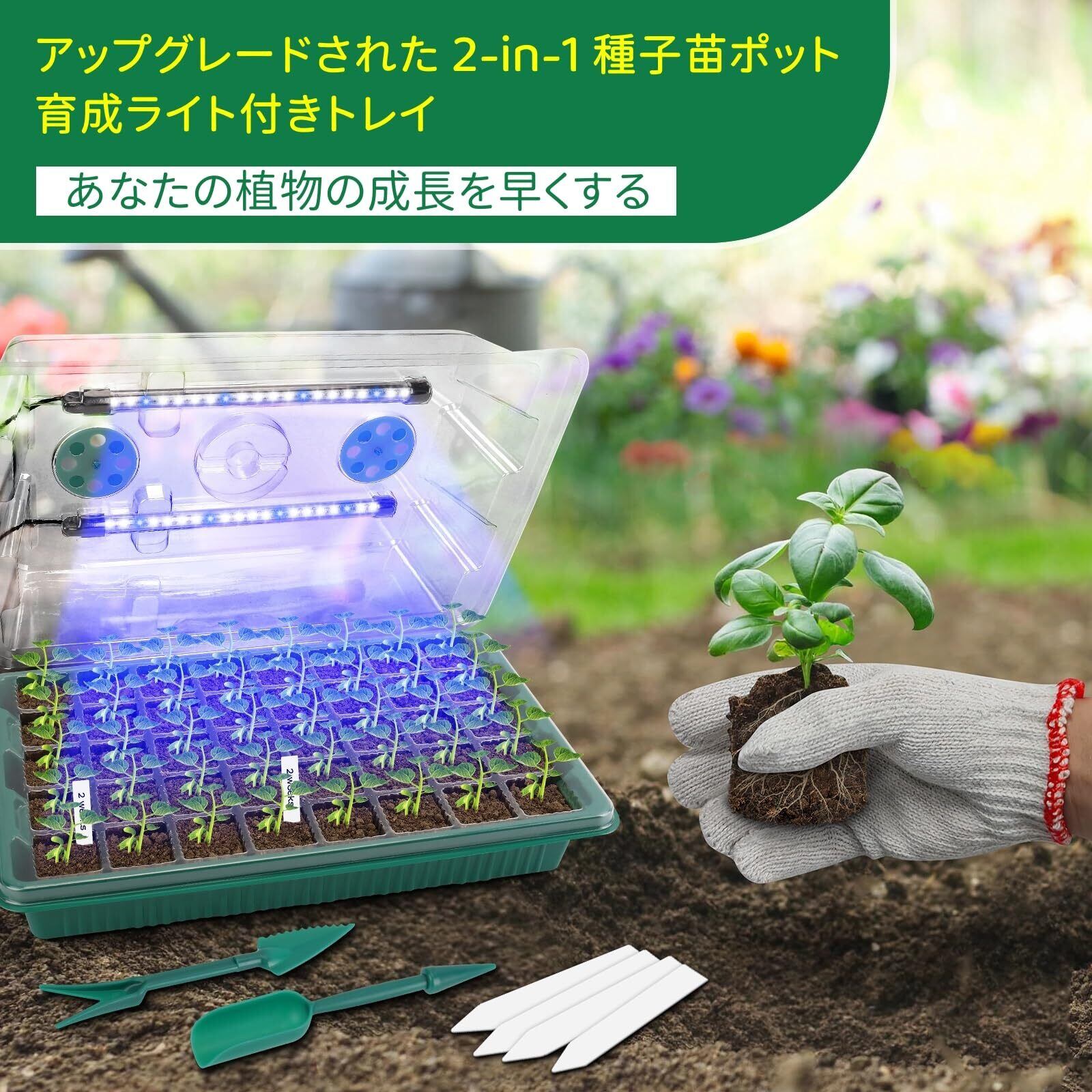【植物育成ライト付き】当社の育苗箱には、植物成長ランプが搭載されており、光質、光強度、光周期を制御するために、種子の発芽、開花および植物成長を常に最適な成長環境にします。ライトは、太陽光のフルスペクトルのように機能します。迅速、自然成長、豊作を実現することができます。