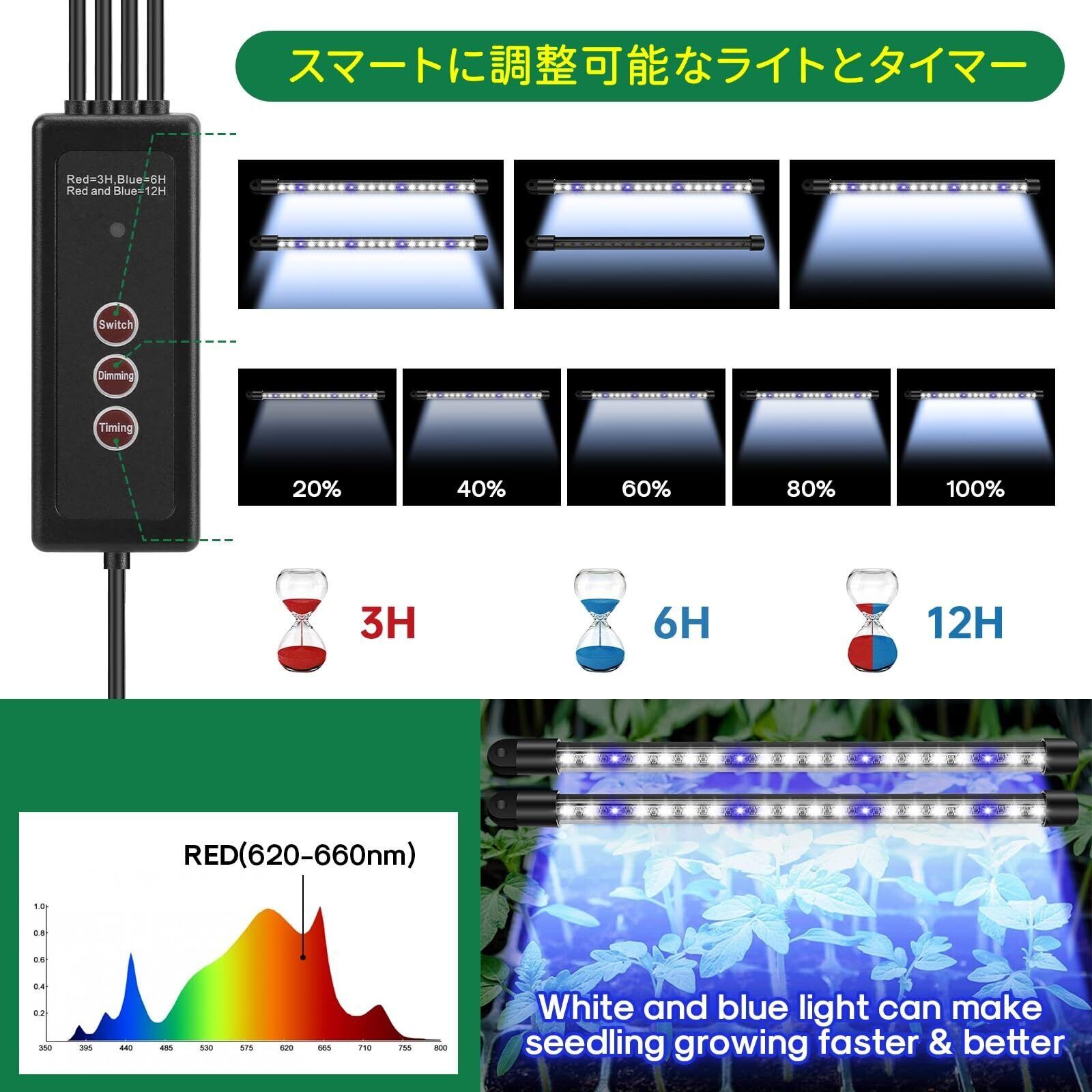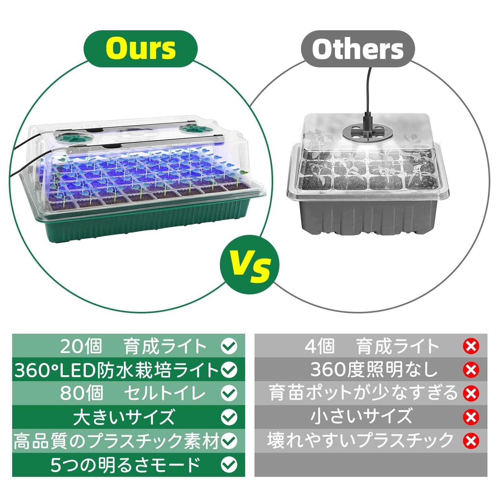 【健康で効率的な成長】私たちの種子スターターキットは、さまざまな植物の苗の小さな種子の成長に理想的なサイズです。野菜、イチゴ、花、果物、その他の植物にも使えます。光の品質、強度、週期を人為的に制御できます湿度、温度、植物は常に最適な生育環境に置かれ、効果的に生育時間を短縮し、作物の収量と品質を高めます。