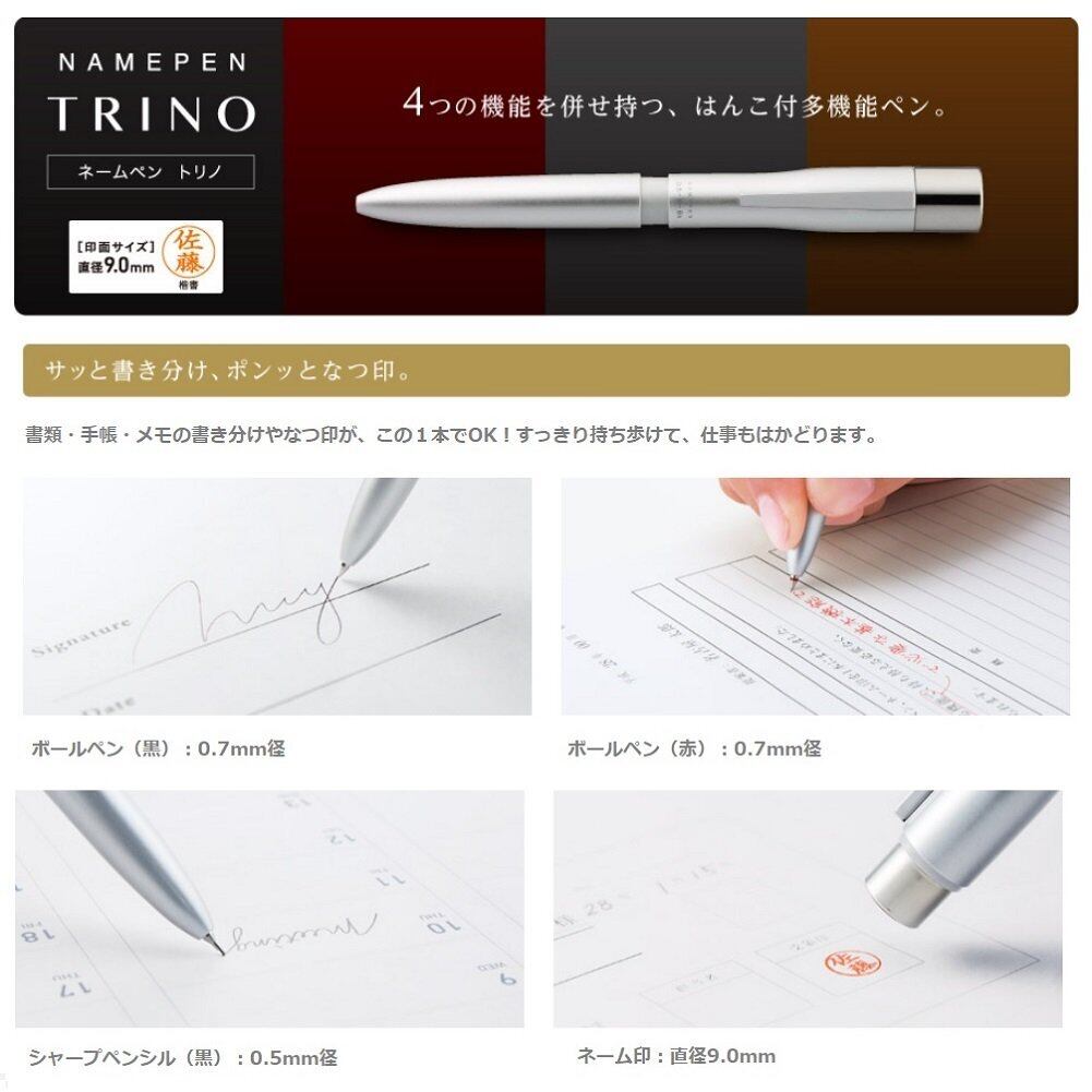 サッと書き分け、ポンッとなつ印。ネーム印と2色の油性ボールペンとシャープペンシルが1本に。エレガントなフォルムに、書く、捺す、という仕事に必要な機能を搭載。