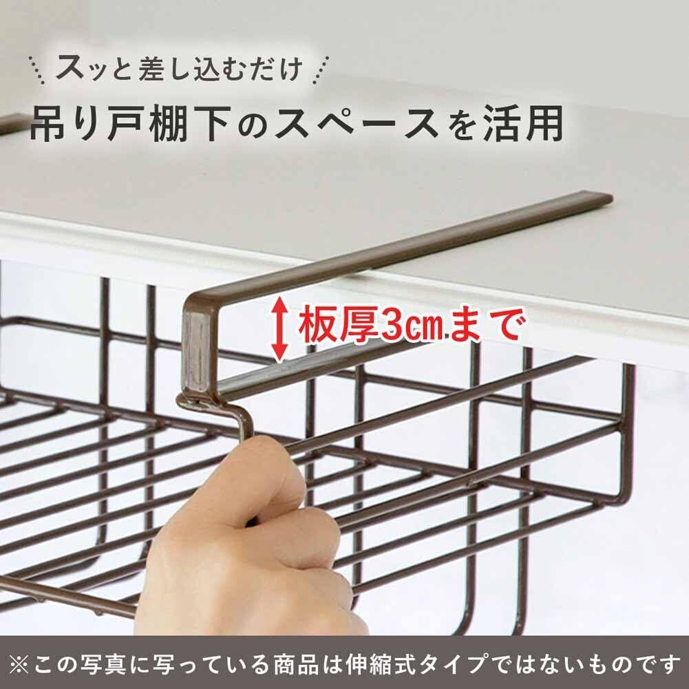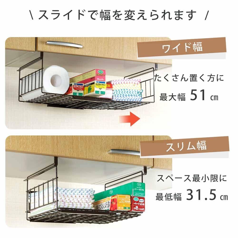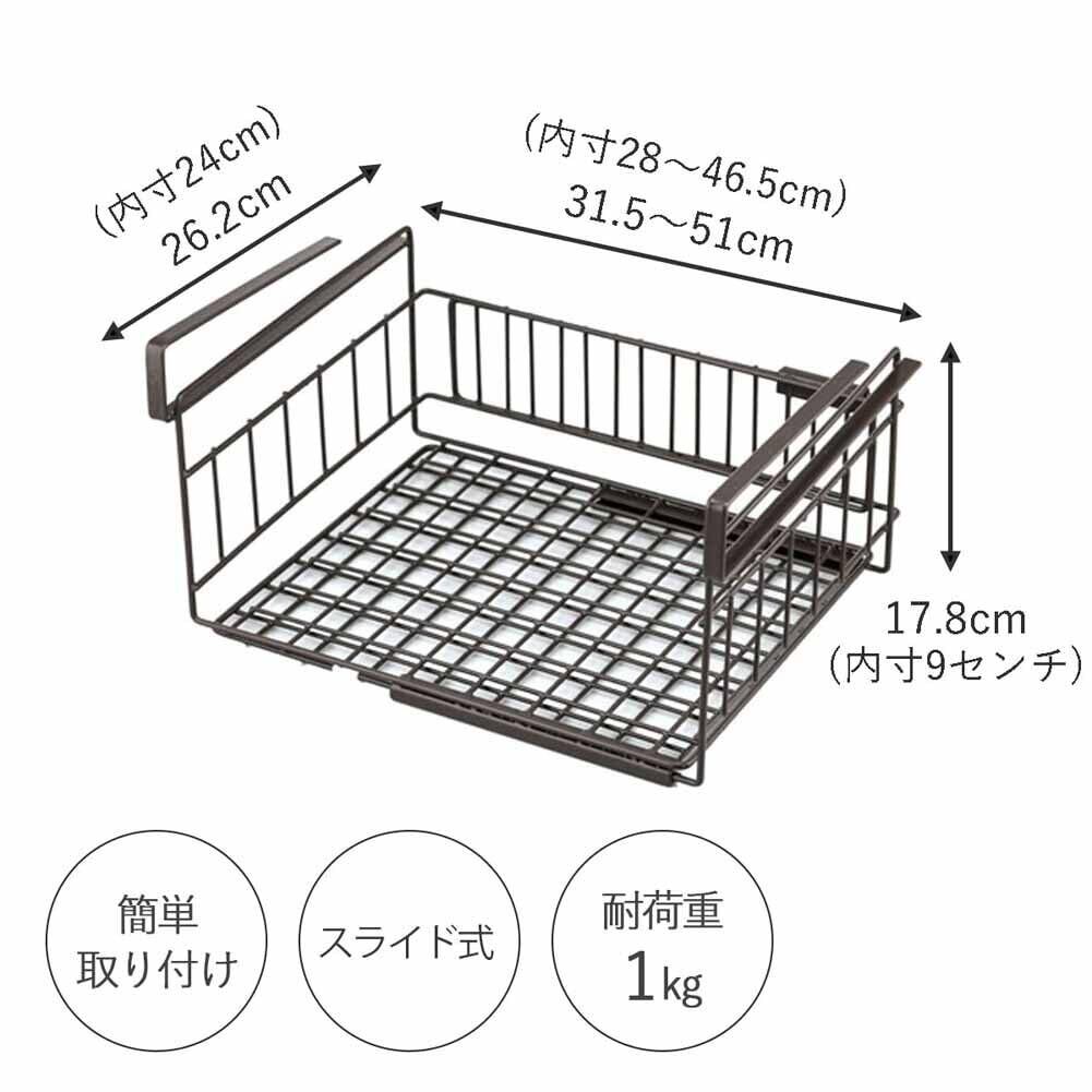 この吊り下げ収納ラックは、下村企販の日本製品です。本体はスチールでポリエチレンコーティングされており、高さ17.8cm、奥行26.2cm、幅31.5~51cmのサイズで、バスケット内寸は幅28~47.5cm、奥行24cm、深さ9cmです。スライド式で、サイズ調整が可能で、ラップやキッチンペーパー、ふきんなどの小物を収納するのに便利です。また、取り付けが簡単で、台所や洗面所などのスペース有効活用に向いています。ブラウンや燕三条など、色々なデザインに対応しています。