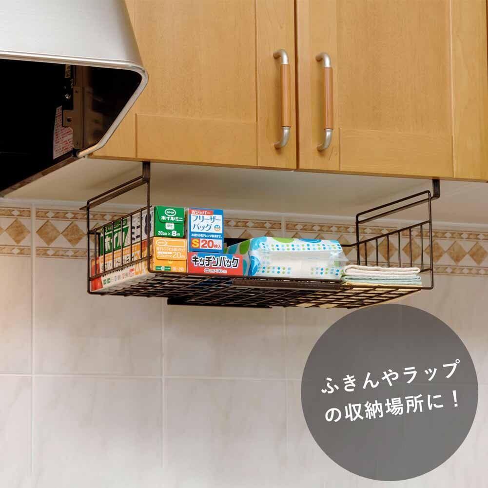 下村企販 吊り下げ収納 キッチンラック スライド式 【日本製】 取り付け簡単 サイズ調整可 ラップ キッチンペーパー ふきん 小物収納 収納ラック 棚下収納 スペース有効活用 台所 洗面所 ブラウン 燕三条 29841