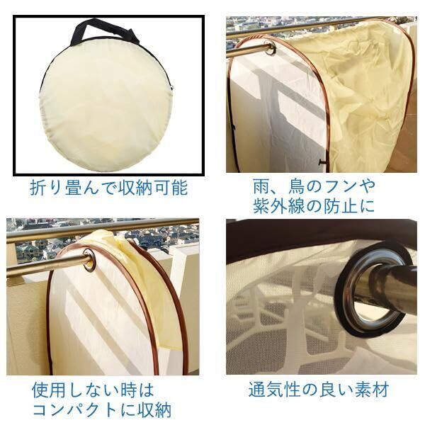 雨が降りそうな時に安心な洗濯物保護カバーです。 カバー部分はUVカット生地なので衣類の紫外線焼けを少なくし洗濯物目隠しカバーとしても使えます。 スベリ止めテープ付きです。 コンパクトになり、物干し竿の端に移動でき邪魔になりません。