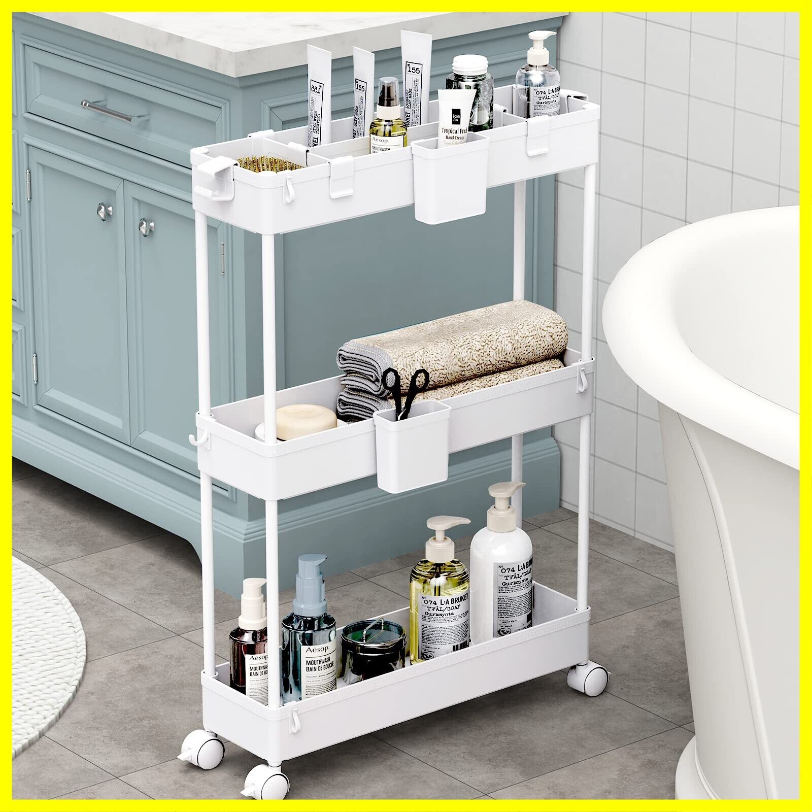 SPACEKEEPER キッチンワゴン 隙間収納 スリム 13cm 収納カップ 仕切板付き 多機能 小物 食品 調味料 キャスター付き 組立簡単 浴室 台所 冷蔵庫横 3段 ホワイト