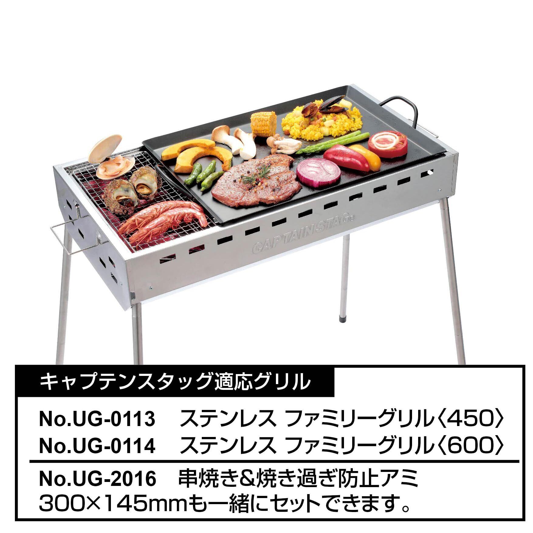キャプテンスタッグ対応グリル:UG-113 ステンレスファミリーグリル(450)、UG-114 ステンレスファミリーグリル(600)、キャプテンスタッグ対応商品:UG-2016 串焼き&焼き過ぎ防止アミ 300×145mm