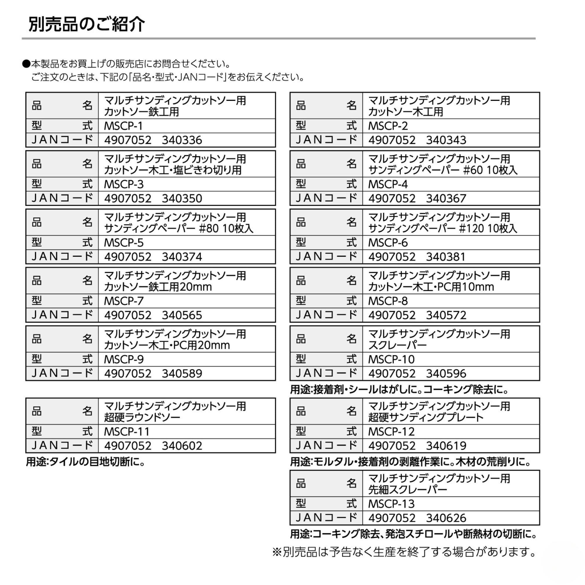 【セット内容】変速マルチサンディングカットソー本体×1、カットソー(木工用)×1、カットソー(鉄工用)×1、サンディングパッド×1、サンディングペーパー#60/#80/#120×各1、収納袋×1、取扱説明書×1