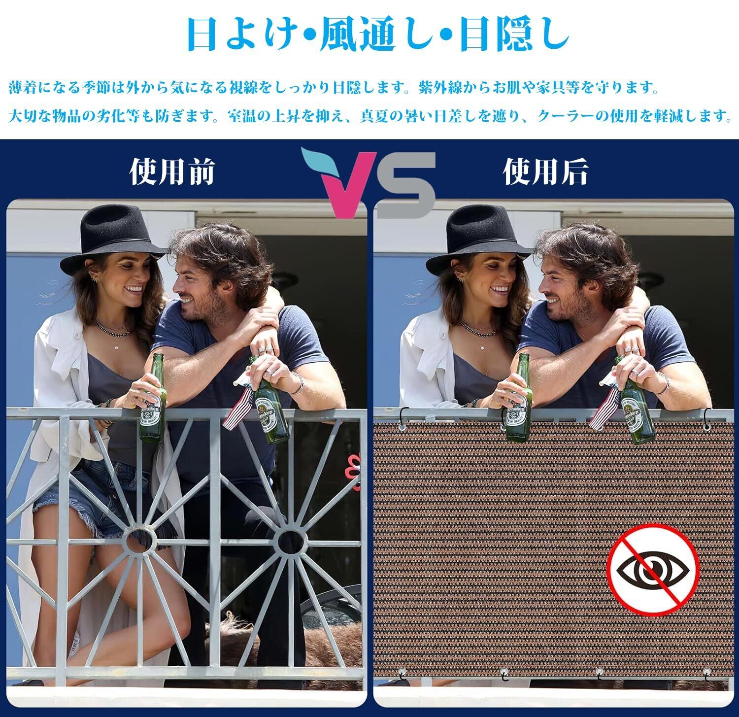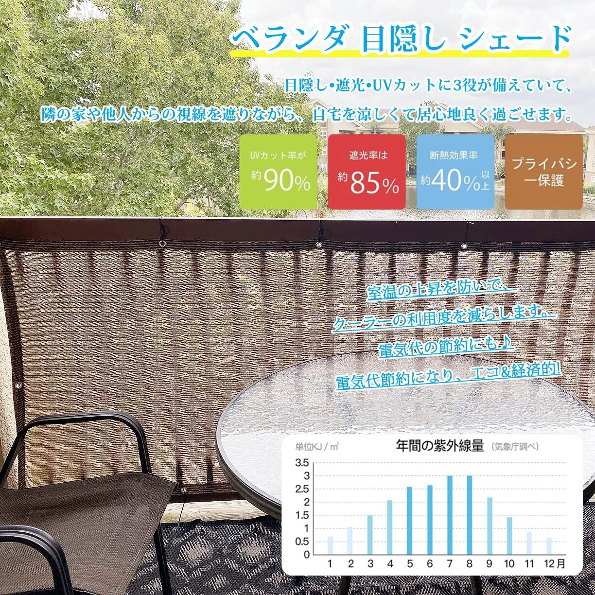 ️【UVカット・日除けシート】耐久性が高く、紫外線に強く、色あせにくい日除けシートです。ベランダの日除けに最適です。直射日光を遮り、紫外線を約95%カットし、遮光率は約85%です。風も通り抜けるため、夏でも快適に過ごせます。窓辺に取り付けることで、日差しや太陽の熱の影響を和らげ、室温の上昇を抑制します。家具を紫外線から保護し、エアコンの使用を抑制して節電に役立ちます。夏に冷房を使わず、省エネでエコな生活を送りたい方におすすめです。