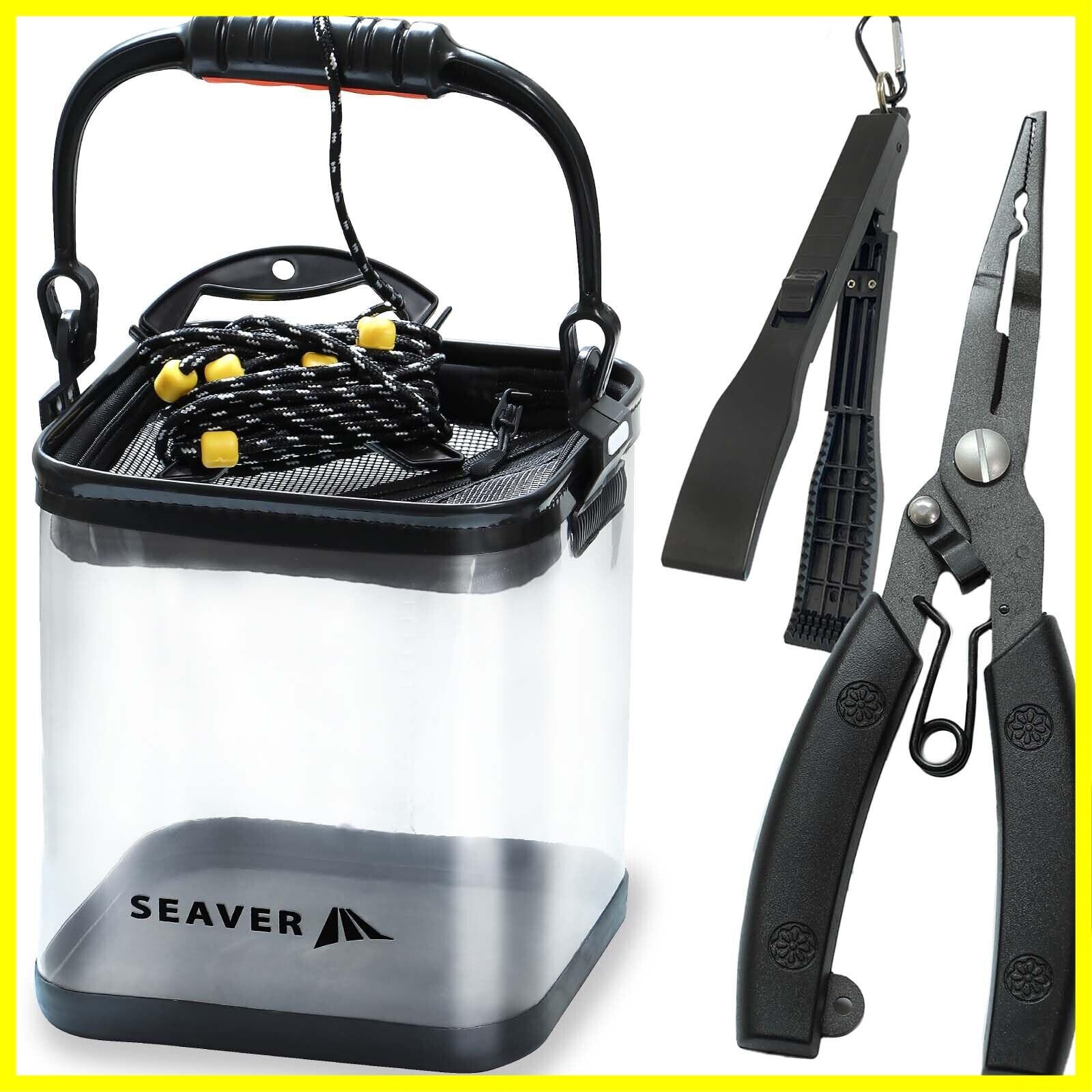 釣り バケツ 透明 選べる 3点セット 【魚が一目瞭然】 釣り道具 水汲み 折りたたみ プライヤー フィッシュグリップ 20cm 24cm SEAVER(シーバー)
