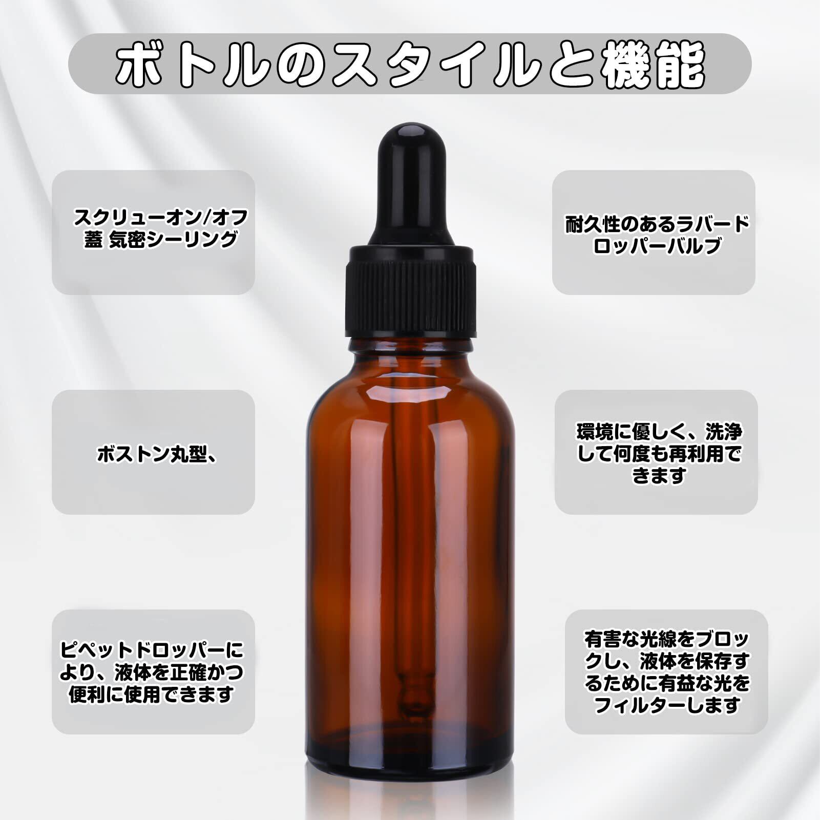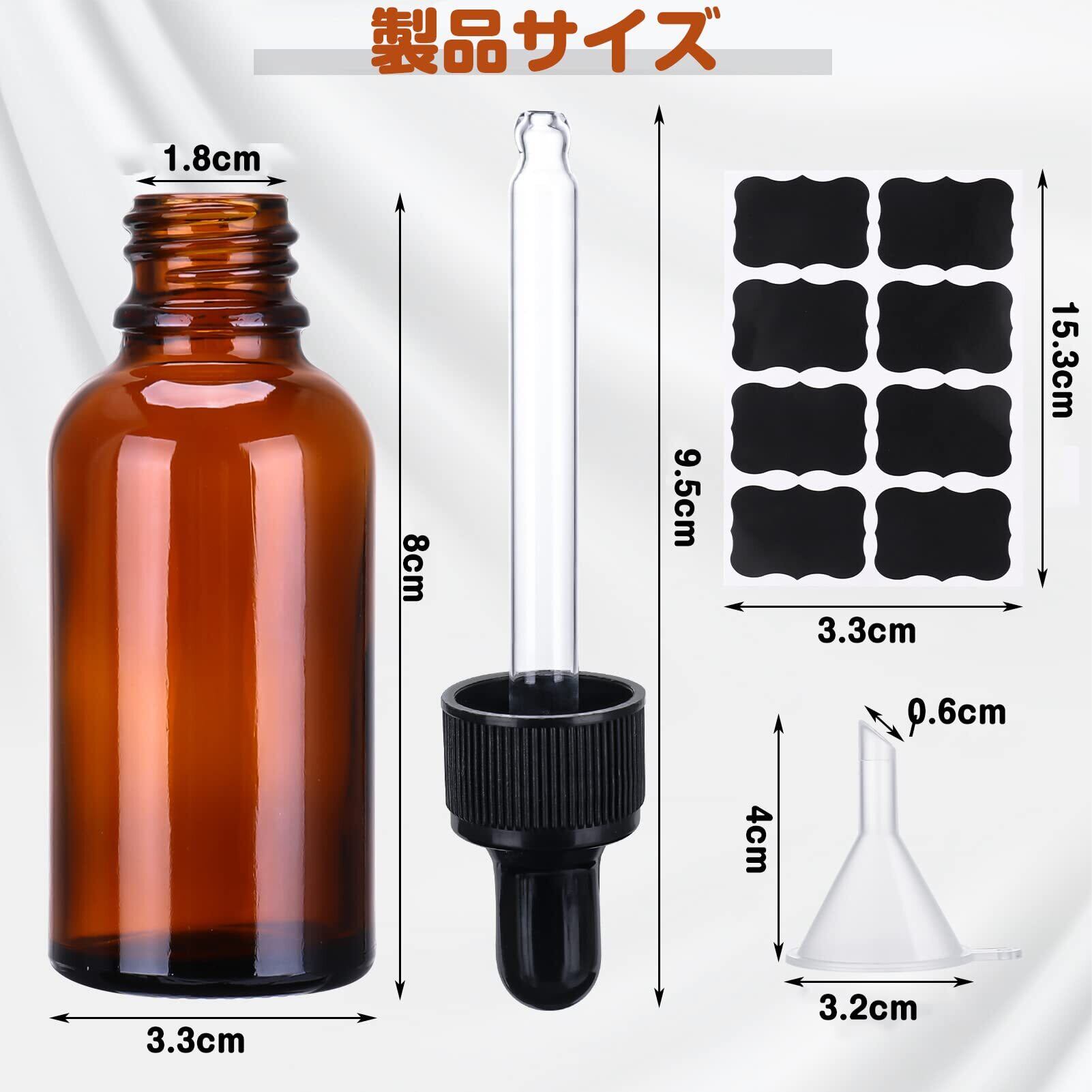 【セット内容】茶色の遮光瓶4本、じょうご2個、シール1枚。容量:30ml。寸法: 長さ 104mm、底の直径 33mm。材質:ガラス(ボトル)、PP+ゴム(キャップ)。