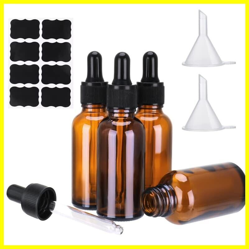 girldate スポイトボトル 30ml 4本セット 遮光瓶 アロマ保存容器 精油瓶 アロマ遮光瓶 ガラス製 茶色 携帯便利 精油小分け 詰め替え 保存用 じょうご付き ステッカー付き