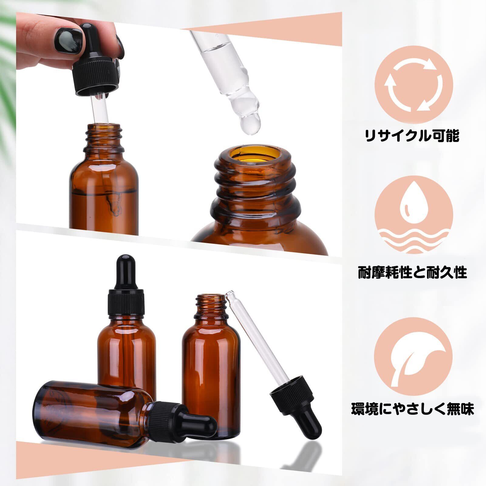 【様々な用途】エッセンシャルオイル、香水、ローション、その他の液体を保管できます。遮光瓶で保管することで、紫外線による劣化を防ぎ、品質を保ちます。さまざまなニーズにお応えします。