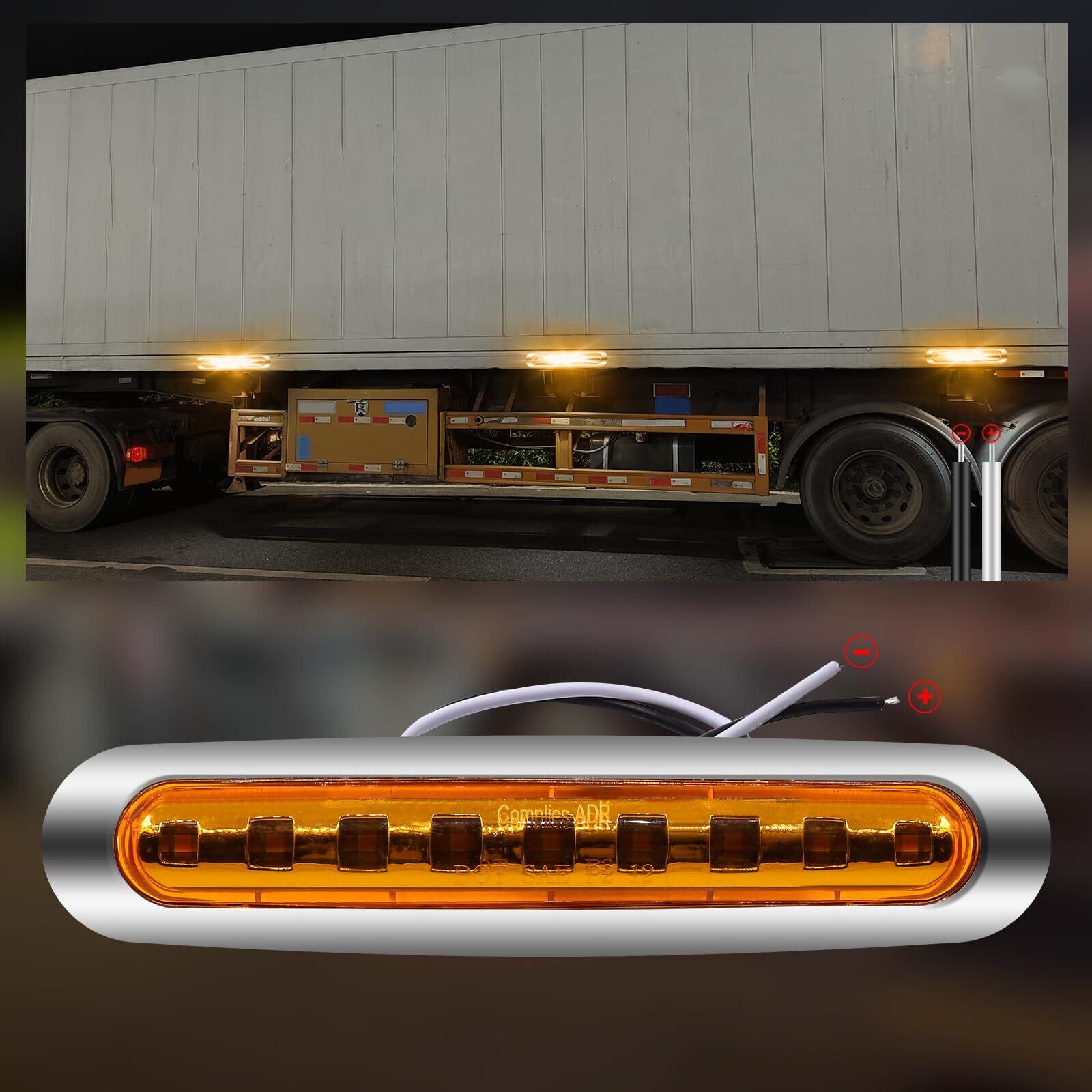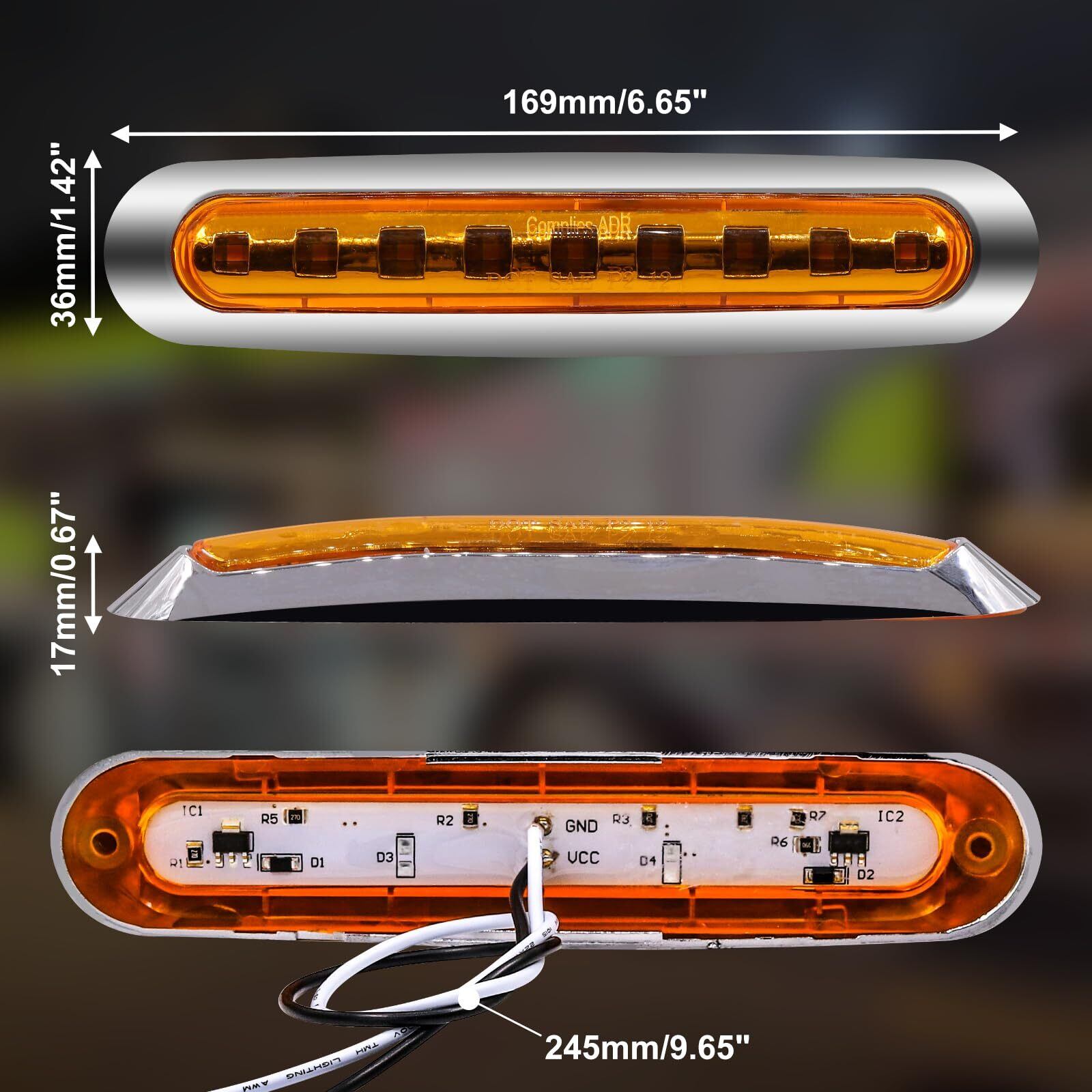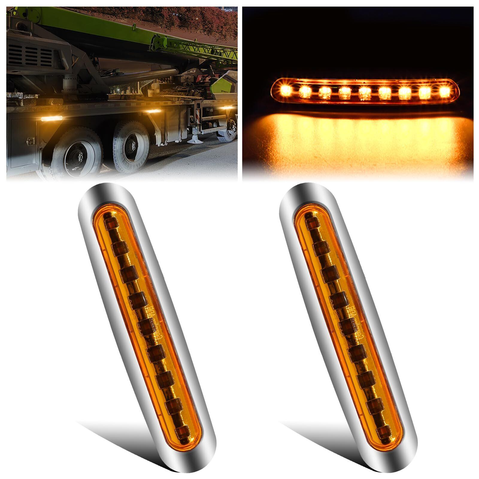 【商品内容】サイズ:169×36×17mm レンズカラー:イエロー 発光色:イエロー 動作電圧:12V 24V対応 材質:クロームメッキ+ABSプラスチック+9個LED発光素子 適応車種:トラック、産業車、トレーラー、バス、RV、デコトラなど様々な車類に適用します。入数:マーカーランプ2個セット