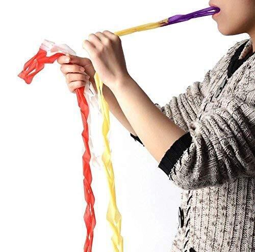 手品の説明・マジシャンの口から白い/虹色紙を吐き出す。さらに驚くのは、テープが約7.5mにも及ぶ。