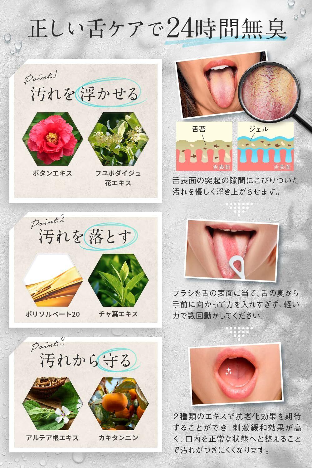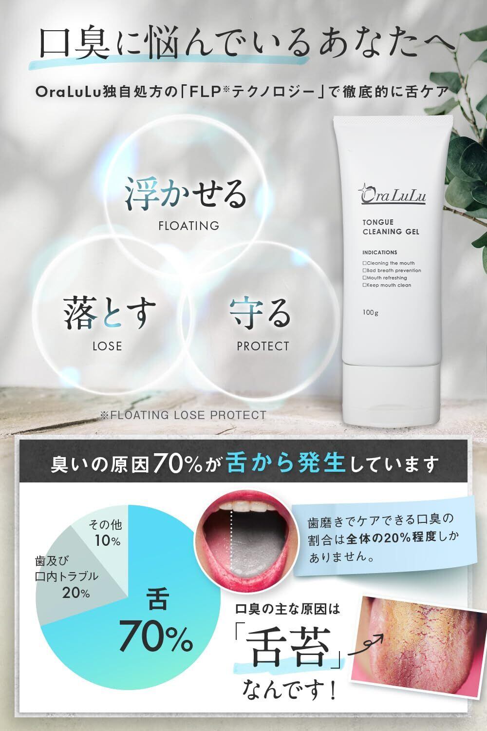 【OraLuLu独自処方で徹底的に舌ケア】・汚れを浮かせる(舌表面の突起の隙間にこびりついた汚れを優しく浮き上がらせます)・浮かせた汚れを落とす(付属の独自設計ブラシで優しくキレイに落とします)・汚れから守る(アルテア根エキス、カキタンニンの2種類のエキスを配合する事により、口内を正常な状態に整える事で汚れがつきにくくなります)