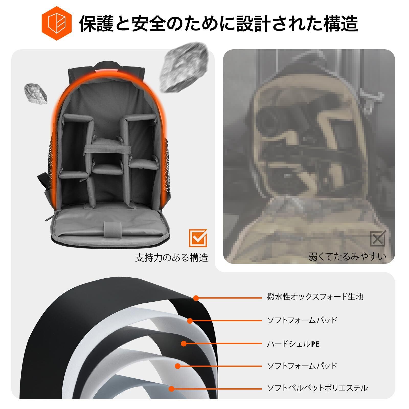 【プロのカメラバックパック】バッグ本体はアルミ構造を採用しており、型崩れを防ぎつつ機材をしっかり保護します。自由組み合わせ可能な綿入り仕切り板付き、カメラ機材などをしっかり守ります。カメラバッグの底にカメラ三脚を取り付けることができます。